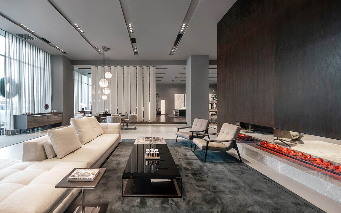 L’espace d’exposition imposant et très lumineux grâce à ses plafonds extrêmement hauts et à ses grandes baies vitrées est sublimé par des couleurs sophistiquées, par une riche sélection d’accessoires et par des luminaires très décoratifs, sans oublier une spectaculaire cheminée habillée de boiseries en châtaignier peintes couleur Tabac. Située au milieu du magasin, cette cheminée est le point focal autour duquel se déploient tous les espaces. Ces derniers présentent une succession structurée de coins détente, repas, couchage et plein air qui accueillent les produits les plus représentatifs de la 2020 Collection, notamment les systèmes de sièges Blazer de Rodolfo Dordoni et Torii de Nendo, les sièges Fynn de GamFratesi et Daiki de Marcio Kogan ainsi que la table à manger Linha, elle aussi de l’architecte brésilien. Ils sont accompagnés par certains des records de vente et des pièces les plus emblématiques des toutes dernières collections Minotti.