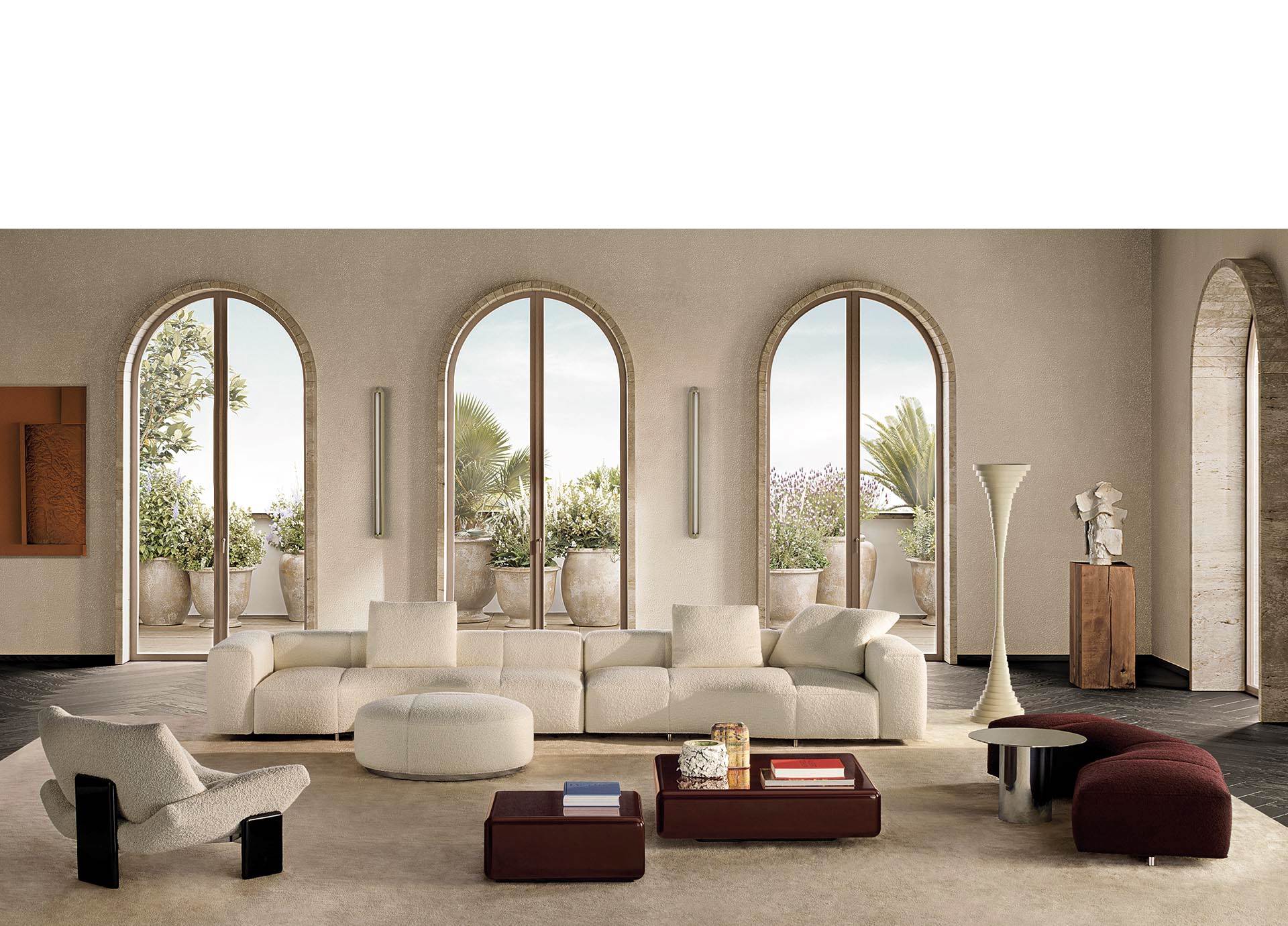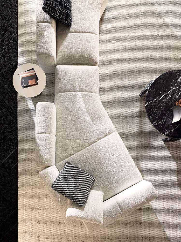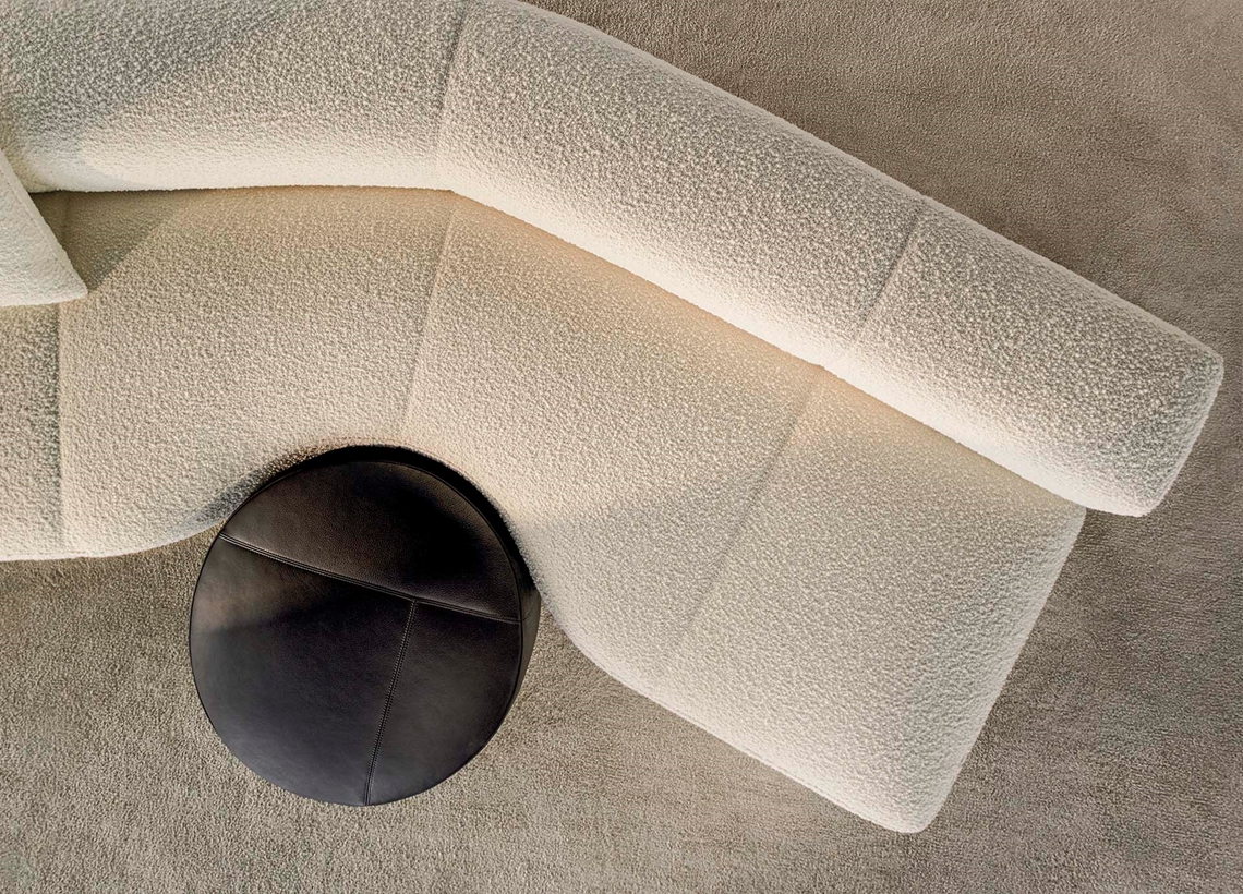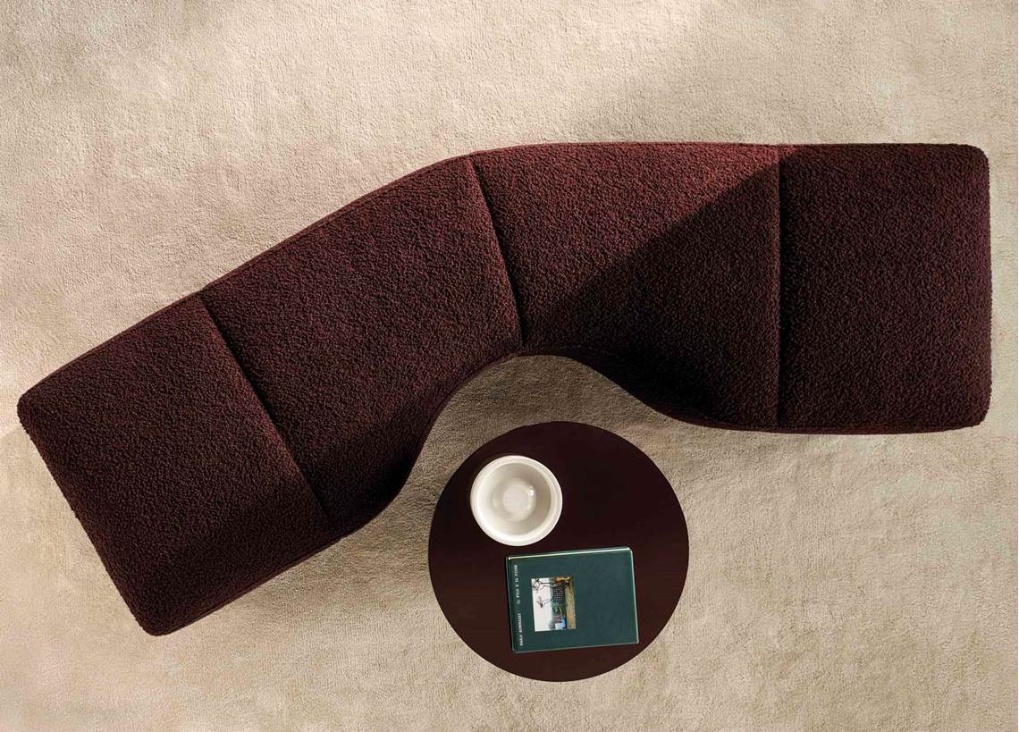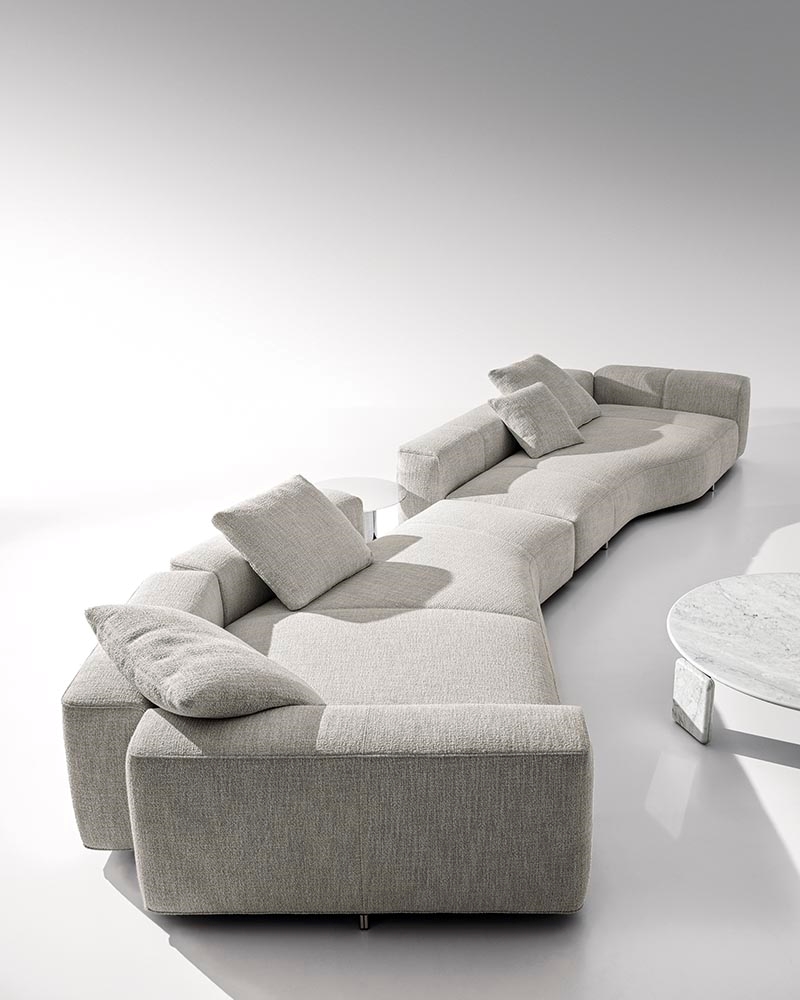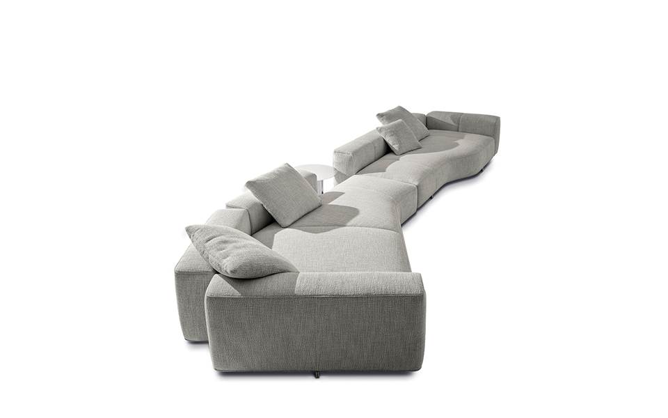 Les lignes fluides des assises monoblocs donnent naissance à plusieurs profondeurs propices à la réalisation de compositions accueillantes ; à l’instar de criques, les modules ouvrent ainsi des espaces qui se transforment en lieux idéaux pour des poufs ou de petites tables pour mieux adapter le canapé à l’évolution constante de l’habitat contemporain.