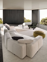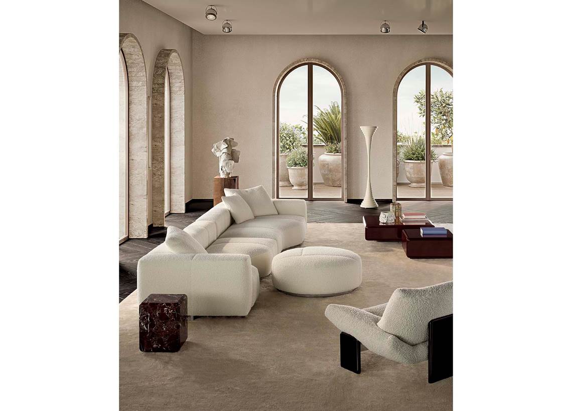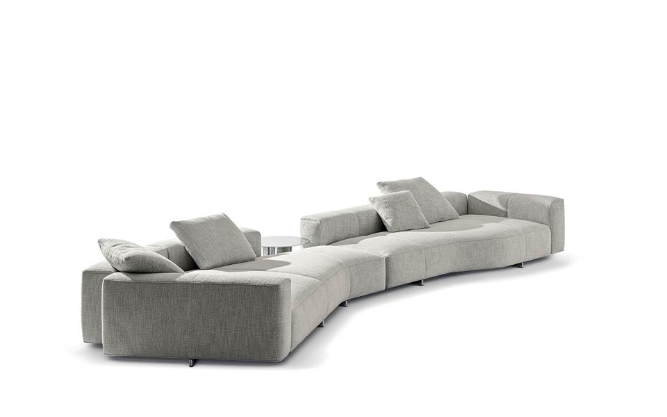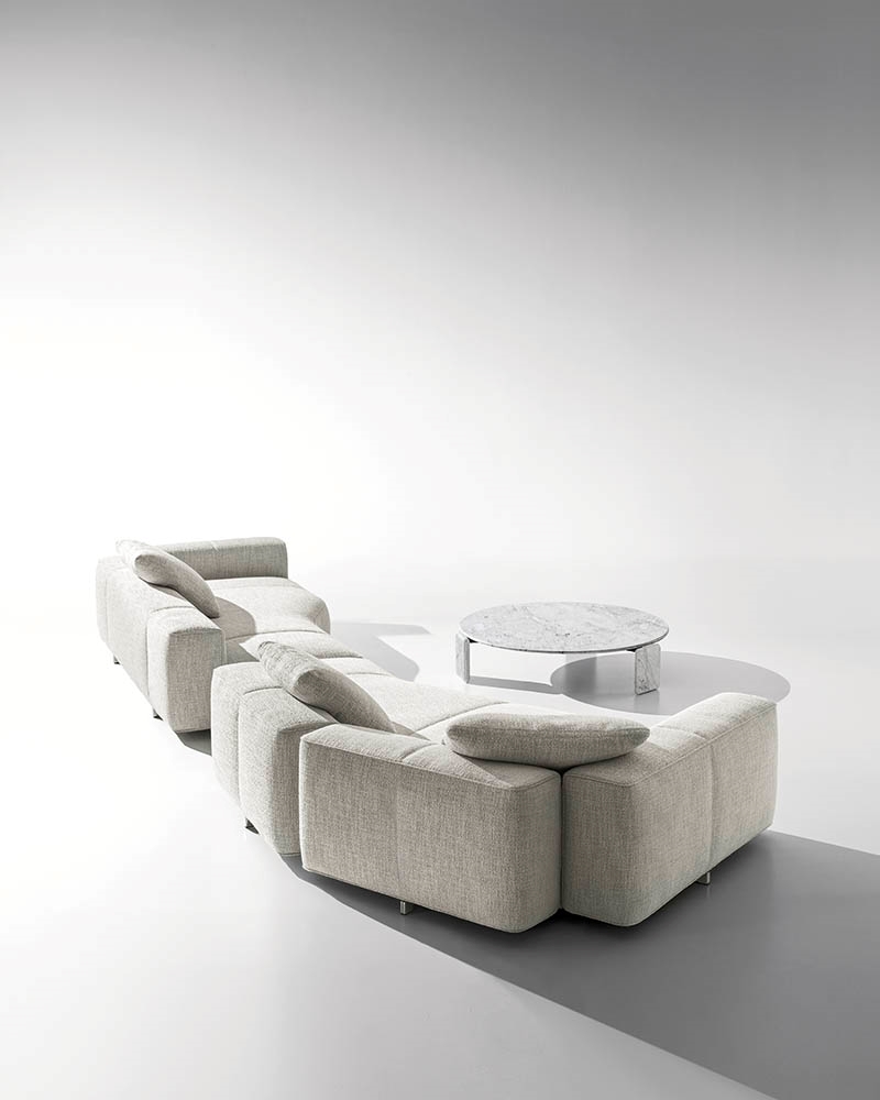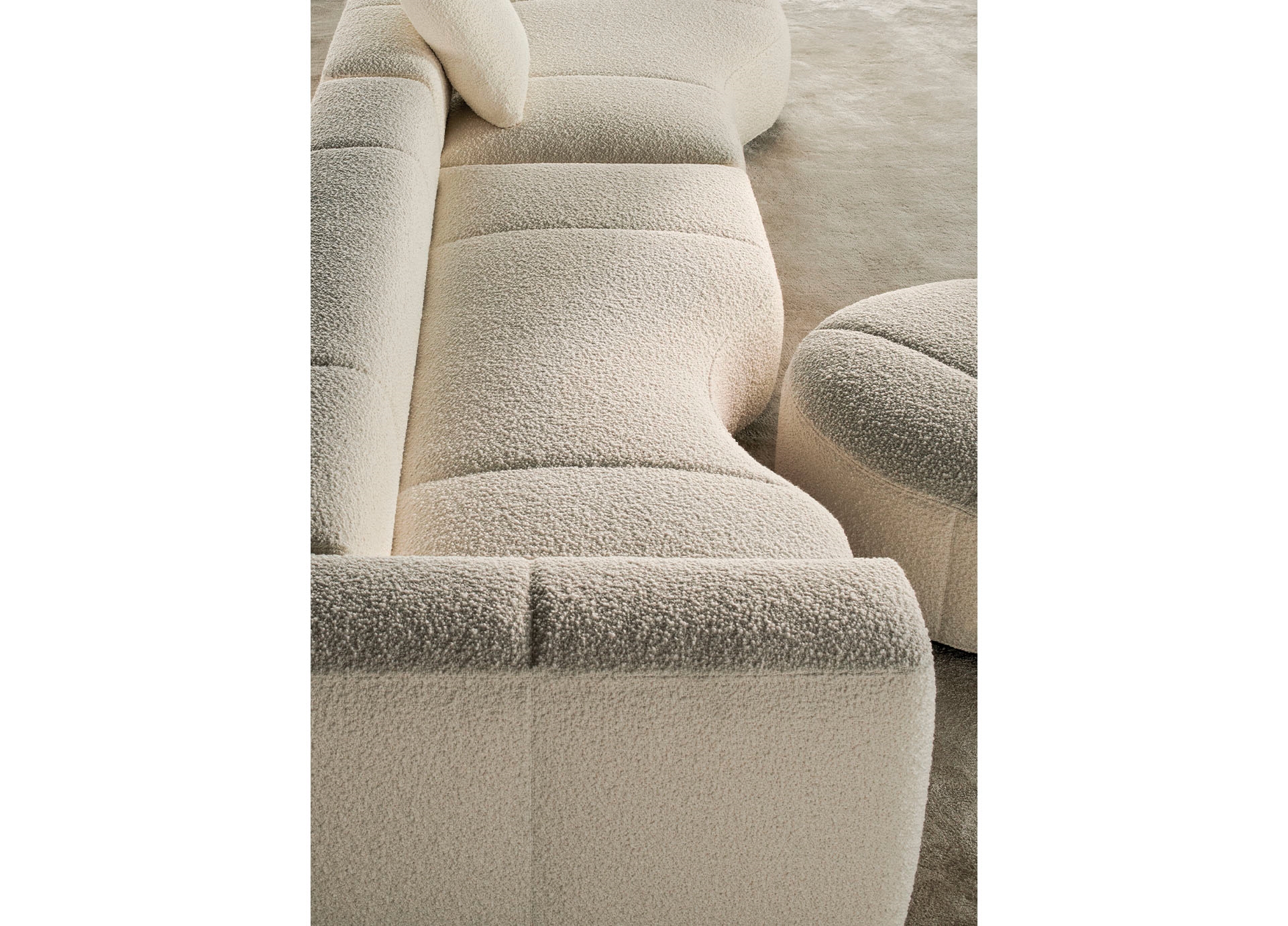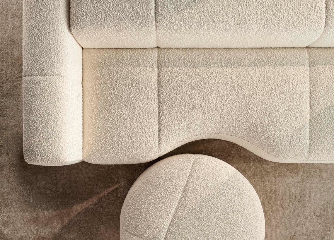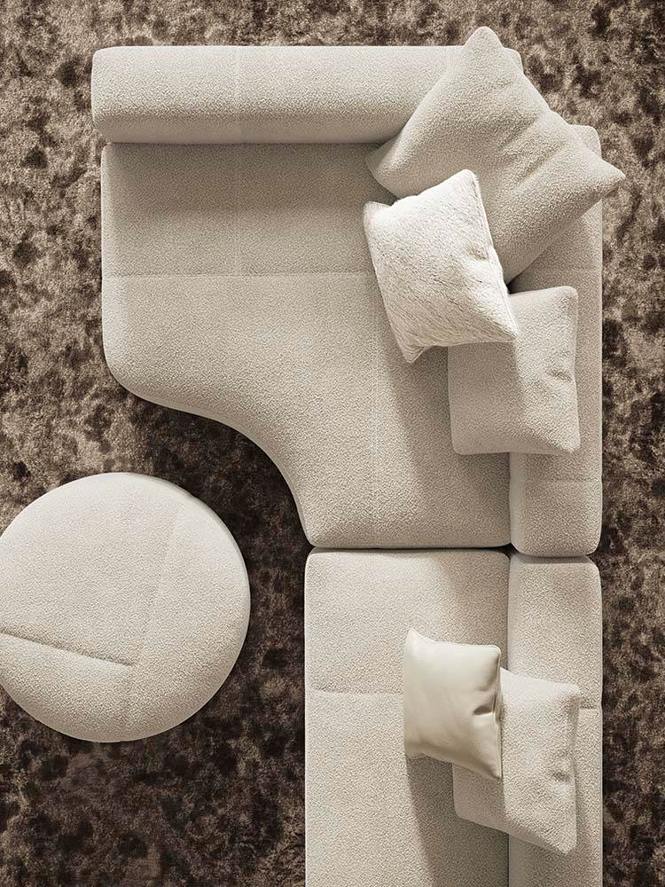 Les lignes fluides des assises monoblocs donnent naissance à plusieurs profondeurs propices à la réalisation de compositions accueillantes ; à l’instar de criques, les modules ouvrent ainsi des espaces qui se transforment en lieux idéaux pour des poufs ou de petites tables pour mieux adapter le canapé à l’évolution constante de l’habitat contemporain.