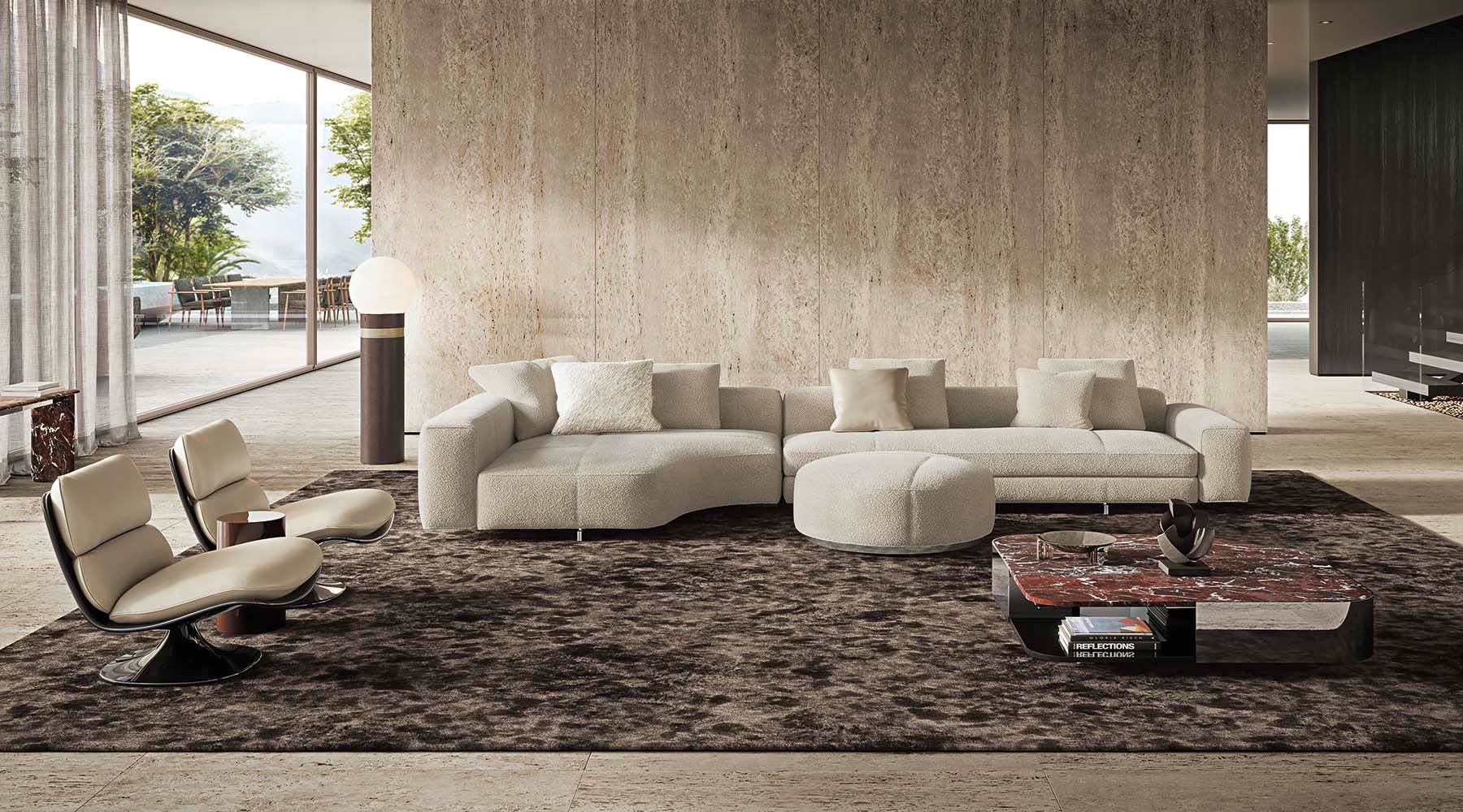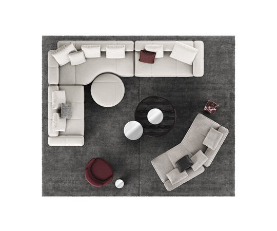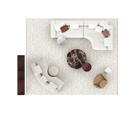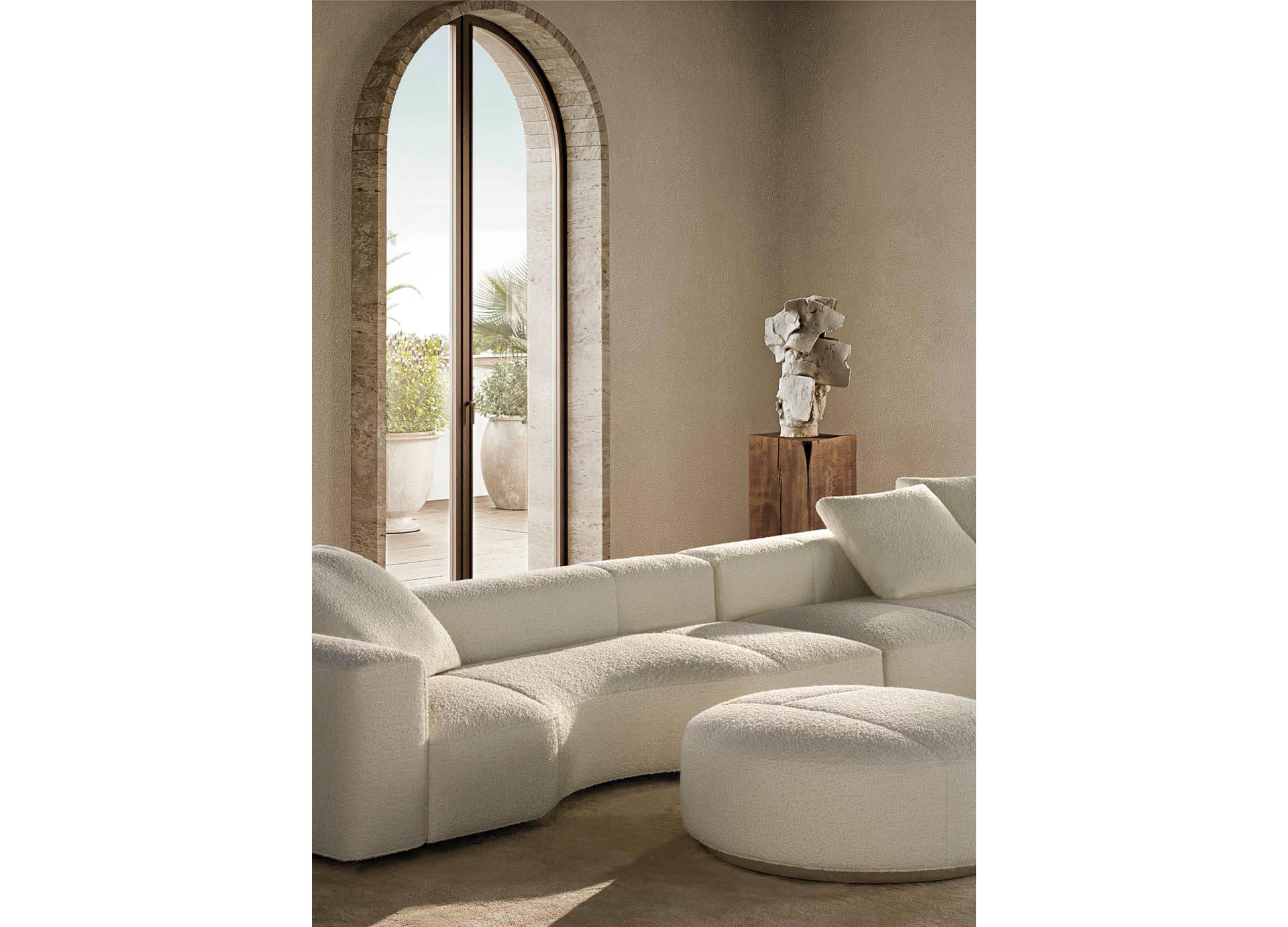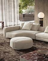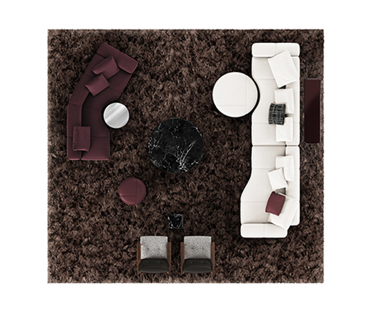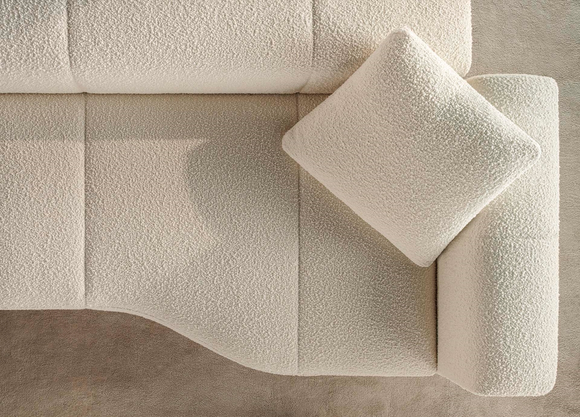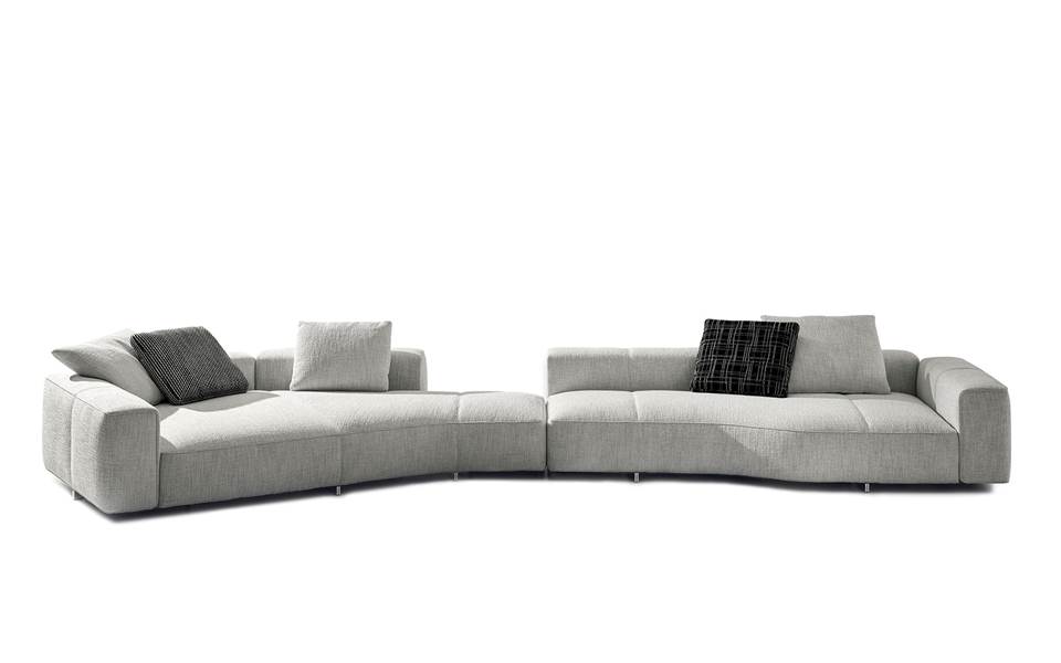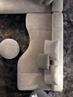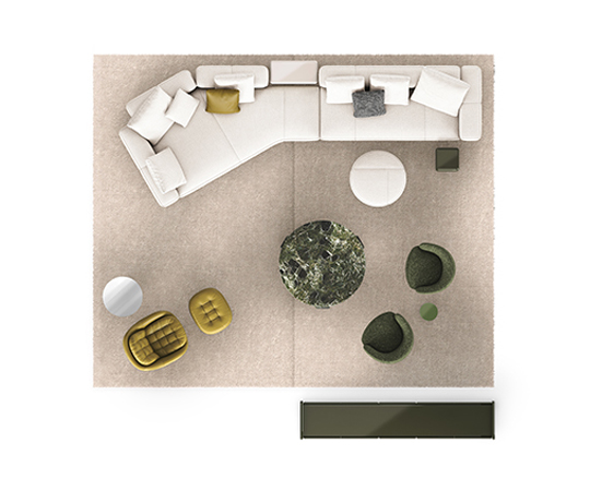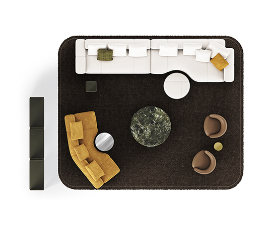 Les lignes fluides des assises monoblocs donnent naissance à plusieurs profondeurs propices à la réalisation de compositions accueillantes ; à l’instar de criques, les modules ouvrent ainsi des espaces qui se transforment en lieux idéaux pour des poufs ou de petites tables pour mieux adapter le canapé à l’évolution constante de l’habitat contemporain.