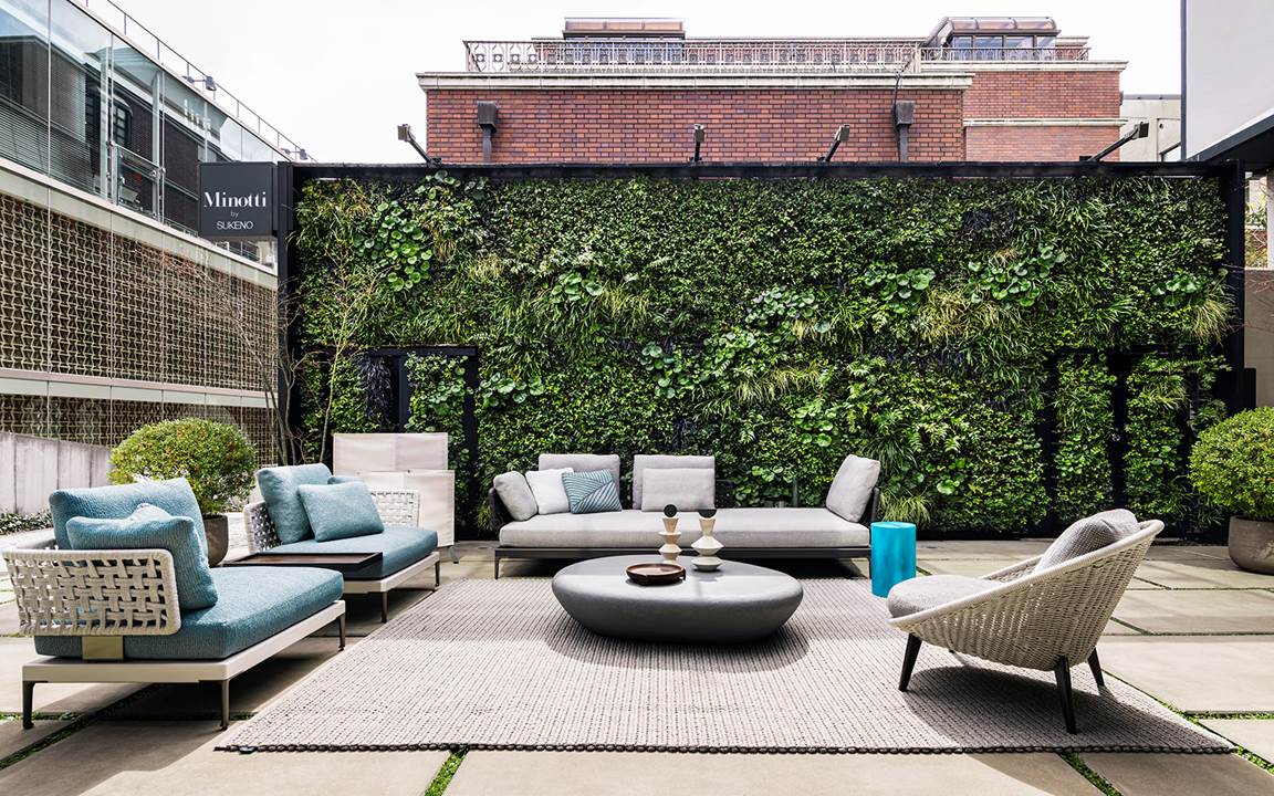 L’effetto sorpresa è dato dal giardino verticale che si staglia lungo la parete esterna concepita come una quinta per l’outdoor Minotti: in questo spazio, caratterizzato da un pavimento grafico “tatami”, protagonista è il sistema di sedute Patio di GamFratesi, dai toni avio, con le poltrone Torii Nest Outdoor di Nendo.