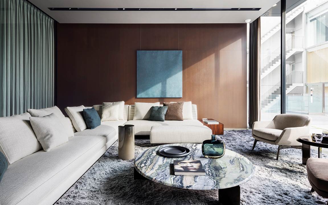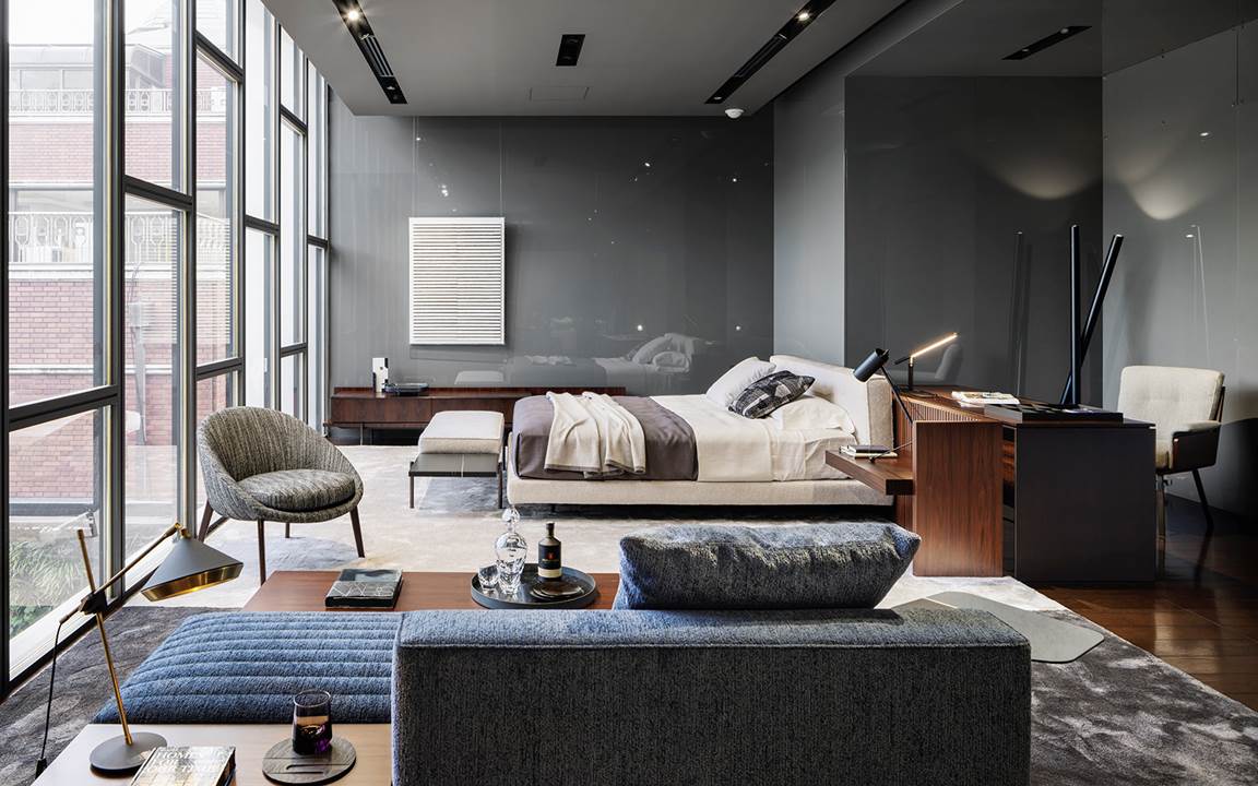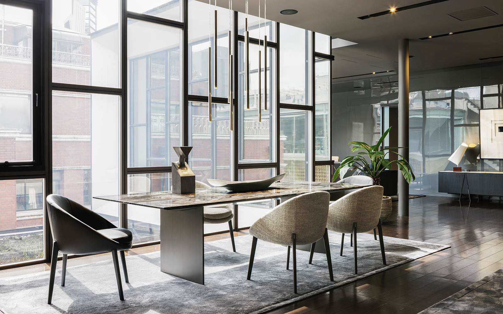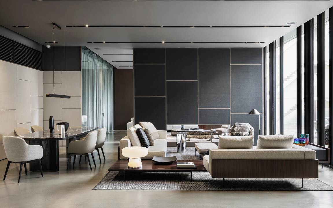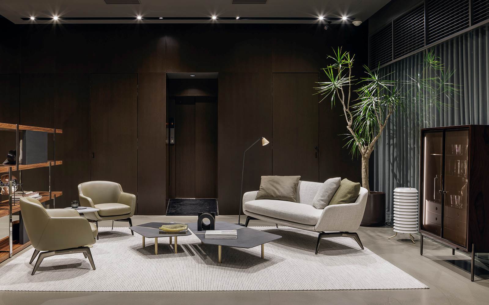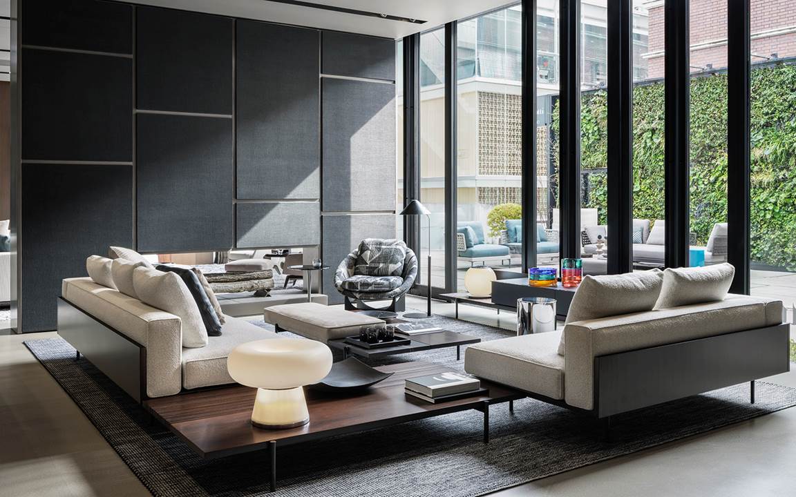 Le ambientazioni indoor, eleganti ed essenziali, caratterizzate da palette di colori tenui, si legano con equilibrio e armonia all’architettura dell’edificio: un vero e proprio invito per una clientela che non si limita a cercare prodotti d’arredo, ma che desidera fare un’esperienza immersiva nel Minotti lifestyle.