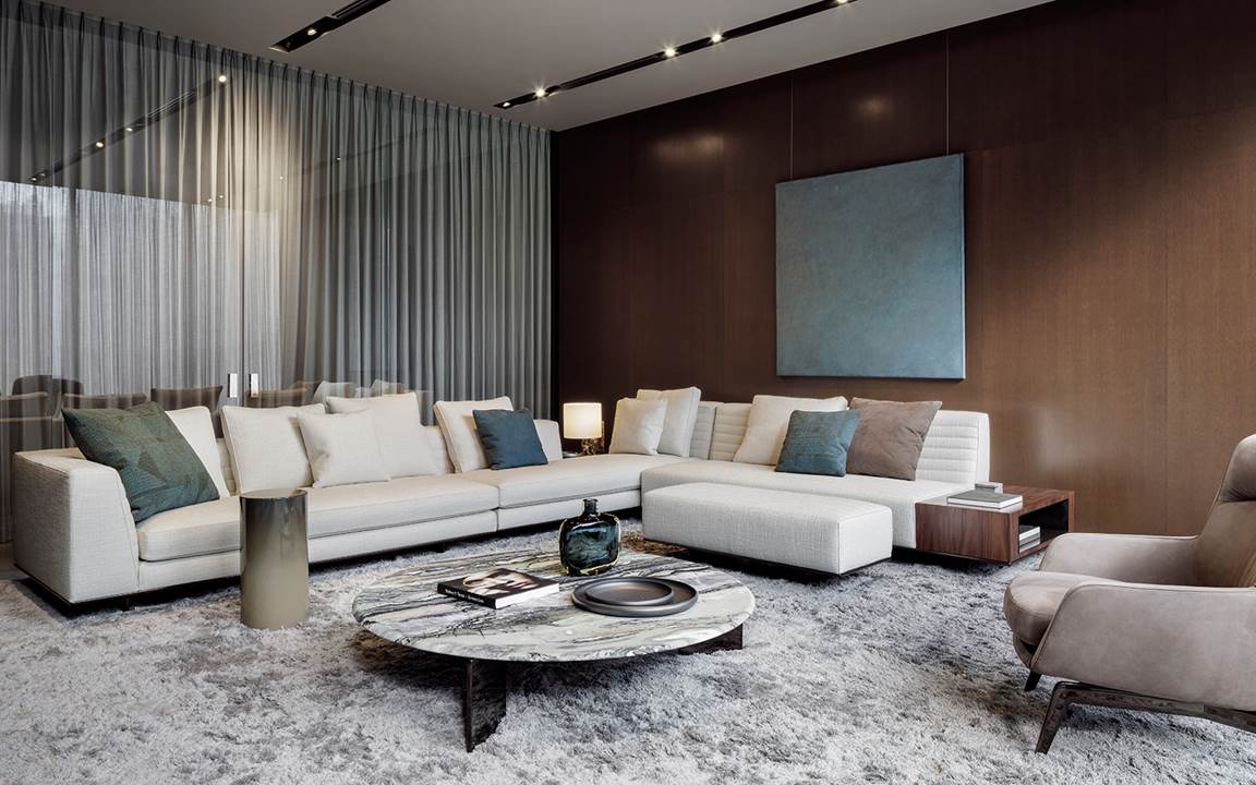 Ampie pareti finestrate rendono completamente trasparente l’edificio e, varcato l’ampio portale in essenza dell’ingresso, due zone living separate da un camino accolgono i sistemi Brasilia di Marcio Kogan / studio mk27 e Roger di Rodolfo Dordoni: una perfetta sintesi della più recente collezione di Minotti, contornata da boiserie rivestite in juta bianca e color carbone.