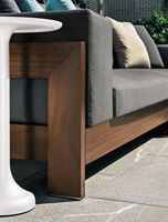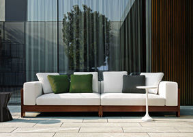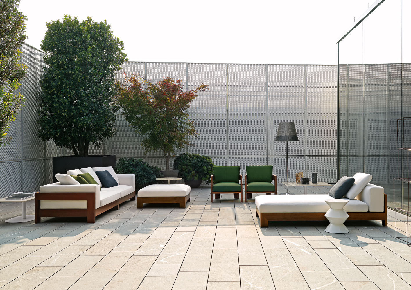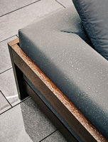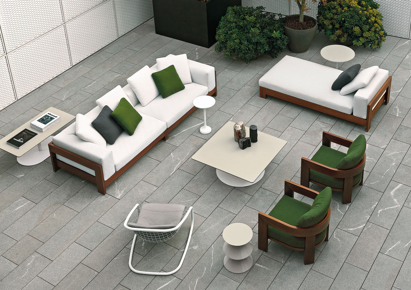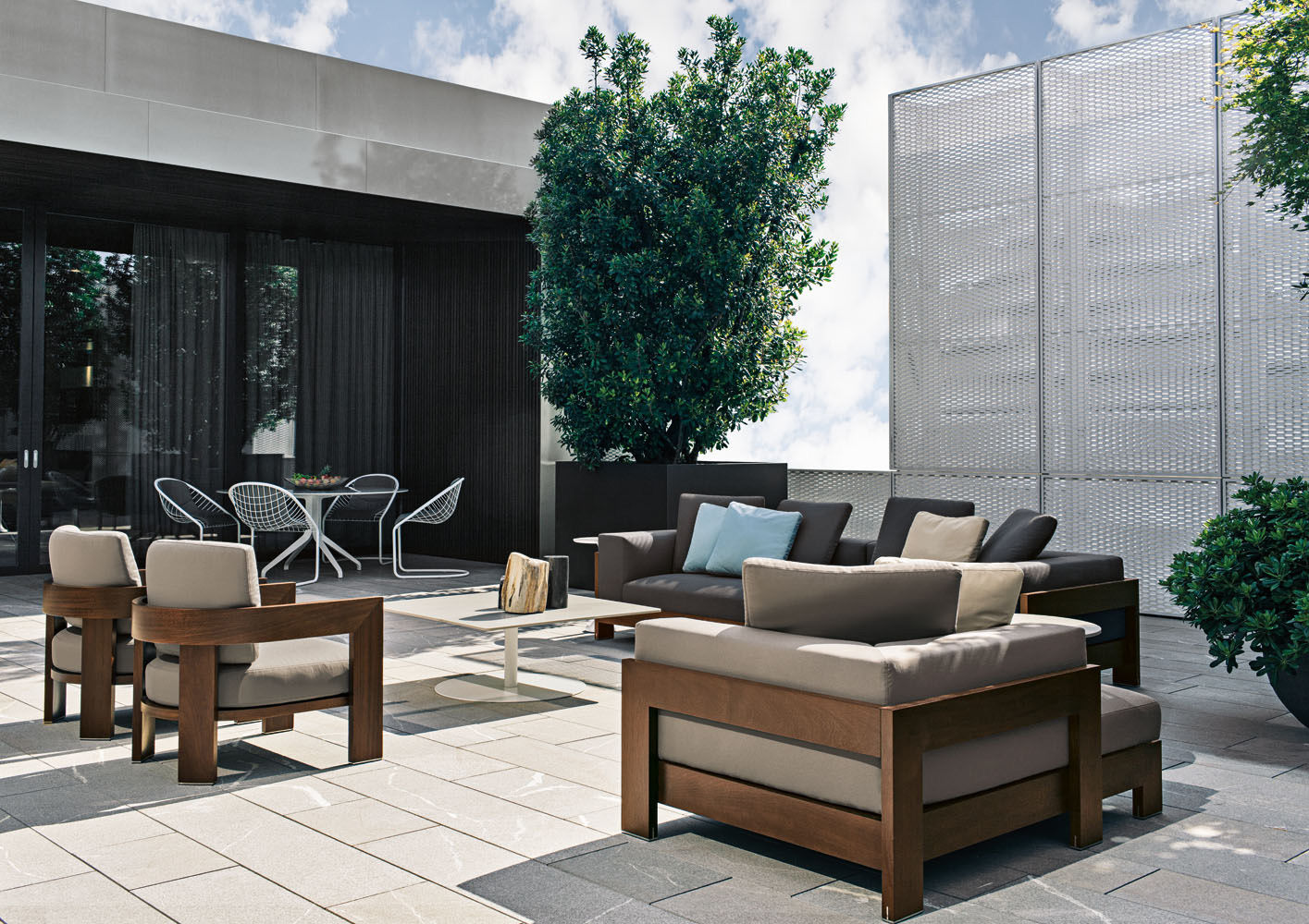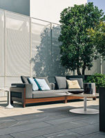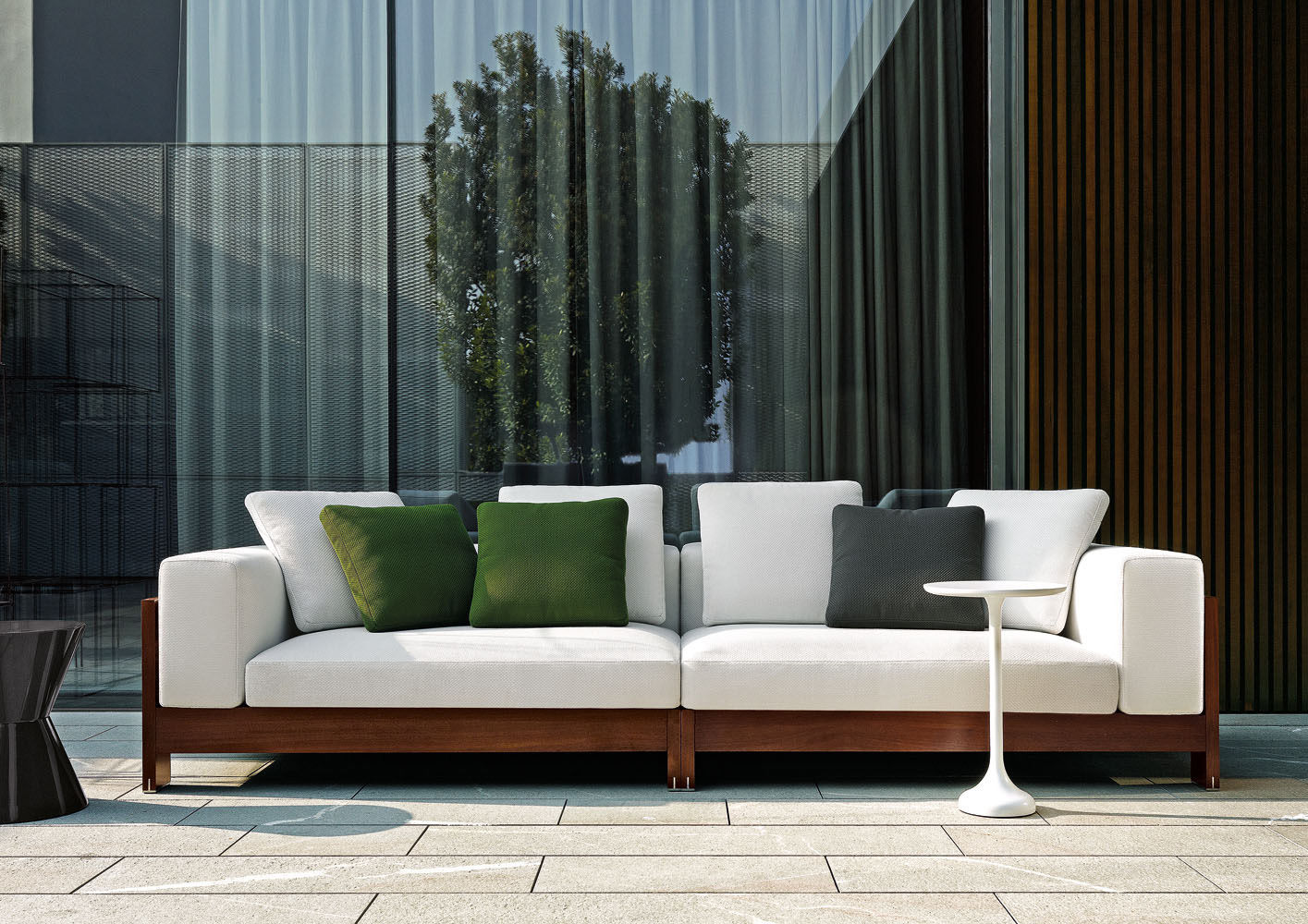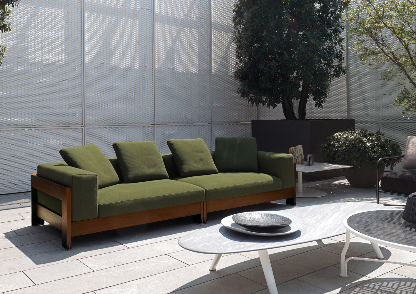 Un sistema di sedute progettato nel 2006 che, nella sua versione in iroko, in qualche modo anticipava il concept della lifescape collection, ovvero una gamma di arredi il cui utilizzo è espressamente pensato sia per interni che per esterni. Il design rigoroso di alison iroko outdoor, con le sue forme squadrate ed essenziali, trova la sua espressione più compiuta nella scelta del massello di iroko per realizzare la struttura a vista. Il suo colore caldo e la piacevolezza al tatto, dovuta alla finitura naturale, danno una forte caratterizzazione alla struttura e valorizzano dettagli costruttivi quali la congiunzione del bracciolo a 45°. Alla pulizia formale della struttura si accompagnano cuscini di seduta, schienale e bracciolo dalle forme anch’esse squadrate ma dalle imbottiture generose. Una nuova ed esclusiva collezione di tessuti per esterni, disponibile in colori e texture ricercati, dona una nota di freschezza e vivacità ai divani alison iroko outdoor. La struttura degli elementi in iroko poggia a terra tramite puntali in acciaio inossidabile inseriti nel massello attraverso una fresata. Questo accorgimento consente di evitare il contatto diretto del legno con il pavimento e di preservarlo dall’umidità.