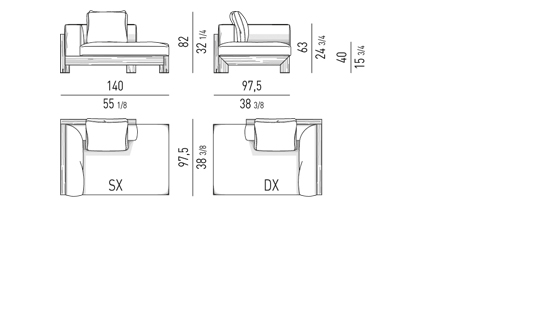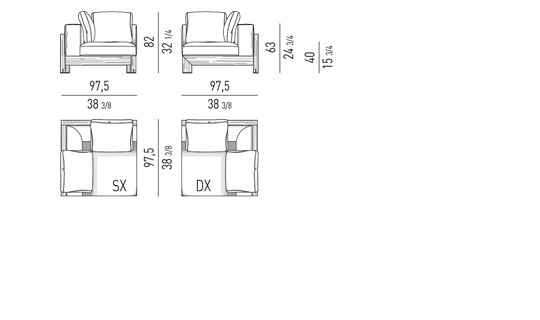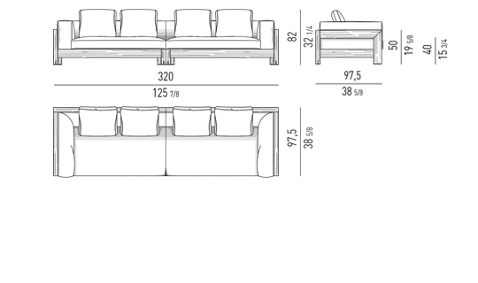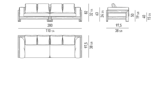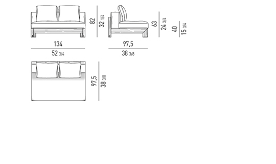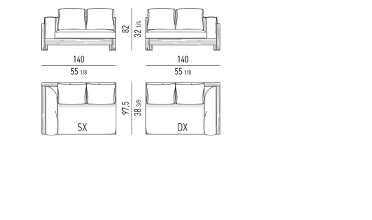 Cuscini schienale composti da un trapuntino di fibra termolegata traspirante accoppiata con tela di cotone bianca anallergica con imbottitura di microfibra siliconata - con basso coefficiente di attrito - che si adatta completamente alla struttura. Tale imbottitura, con elevate caratteristiche di morbidezza e sofficità, è ottenuta da PET 100% riciclato certificato. Tutti i materiali impiegati nella realizzazione del trapuntino sono anallergici. Imbottitura cuscini sedile in poliuretano espanso ad alta densità e resilienza rivestiti in fibra sintetica anallergica. Al fine di migliorare la protezione delle imbottiture di cuscini schienale, cuscini seduta e braccioli da acqua e umidità, tutti i cuscini sono rivestiti con una fodera in poliestere con trattamento idrorepellente e cucita con sistema tradizionale. Tutti gli accessori utilizzati per la confezione - cerniere, filo - sono idrorepellenti e pertanto idonei all’utilizzo outdoor.