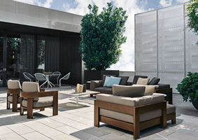 Un sistema di sedute dalle linee squadrate ed essenziali che trova la sua espressione più compiuta nella scelta del massello di iroko scelto per realizzare la struttura a vista.