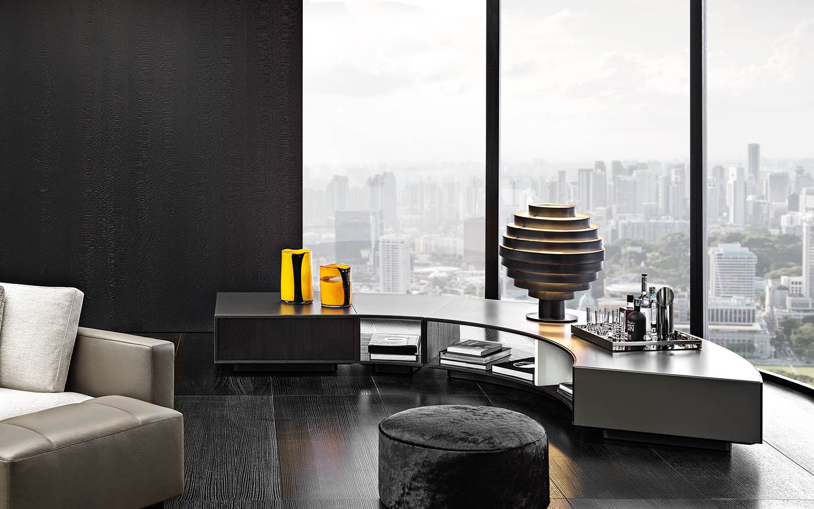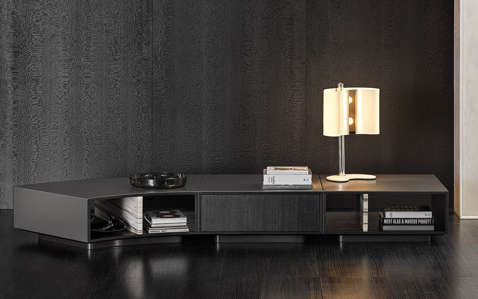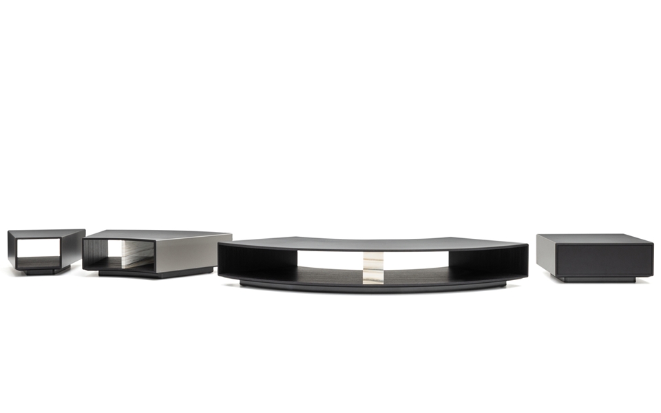 Con un disegno che sviluppa il quarto, l’ottavo e il sedicesimo di cerchio in elementi tridimensionali, i mobili bassi Amber suggeriscono visioni di mobili componibili all’infinito con forme che si snodano nello spazio.