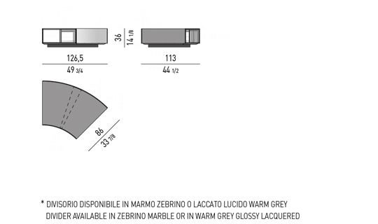 Si presenta con una struttura in essenza wengé color Moka, foderata esternamente da un foglio in metallo colore Malto opaco, e in alcune dimensioni è impreziosito da un setto in marmo Zebrino o laccato lucido Warm Grey.