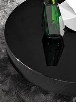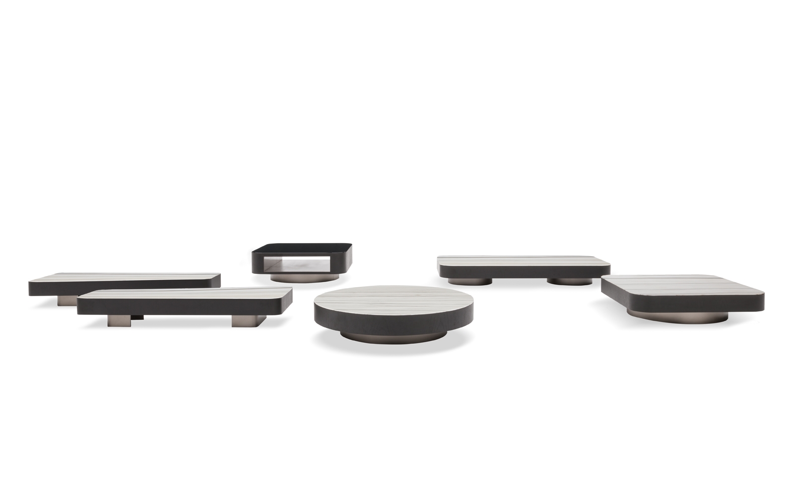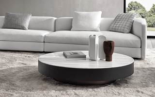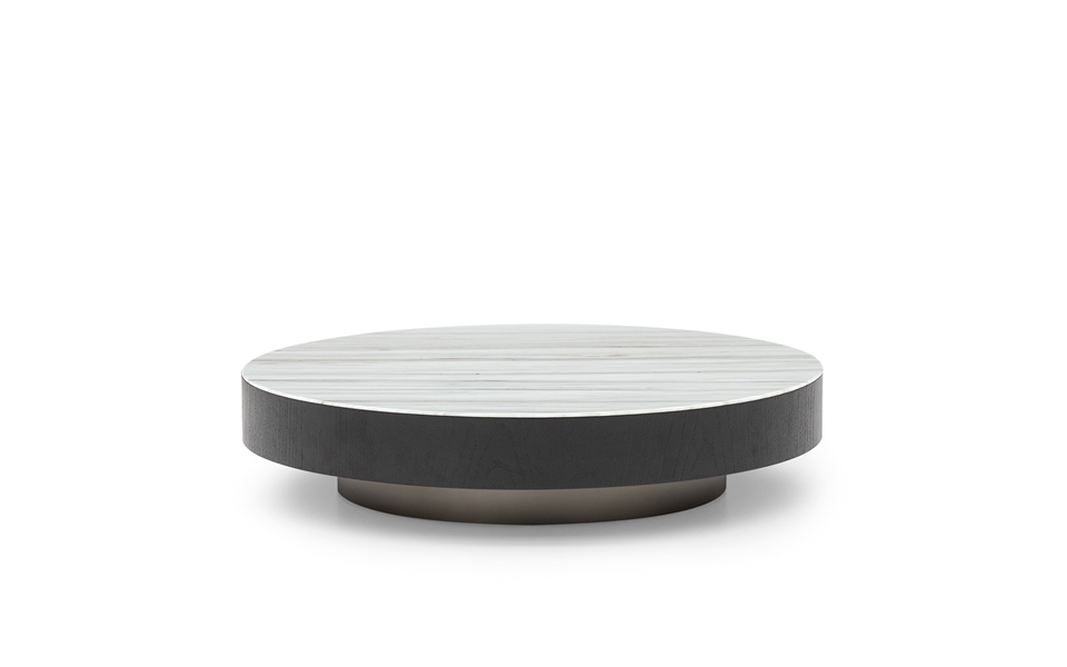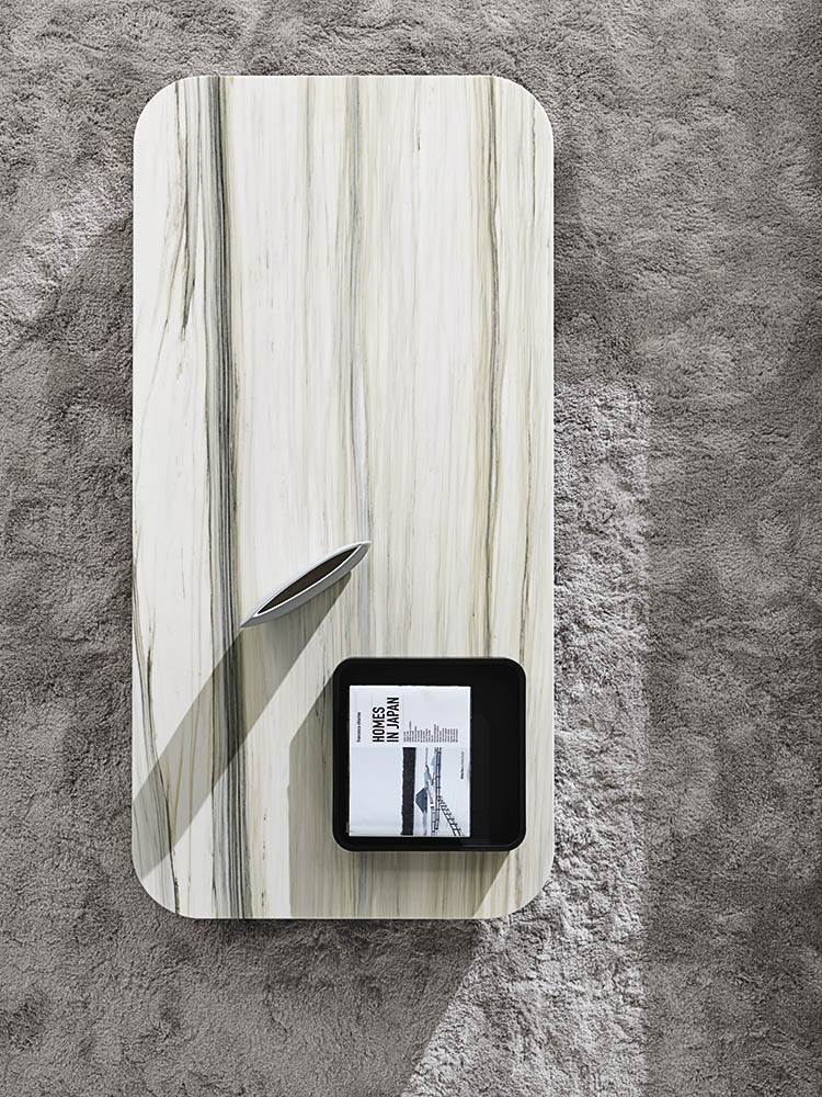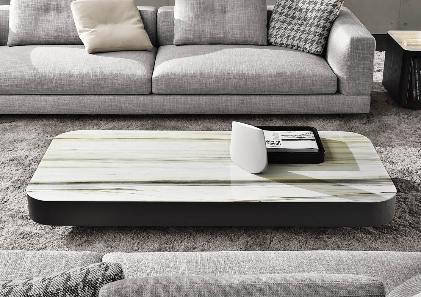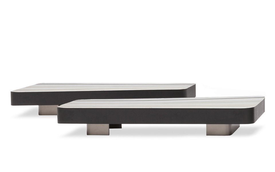 Nonostante le proporzioni generose dei piani, i tavolini, grazie alla loro altezza ridotta, non risultano invasivi nello spazio del living, ma fungono da elementi-isola piacevolmente decorativi e funzionali.