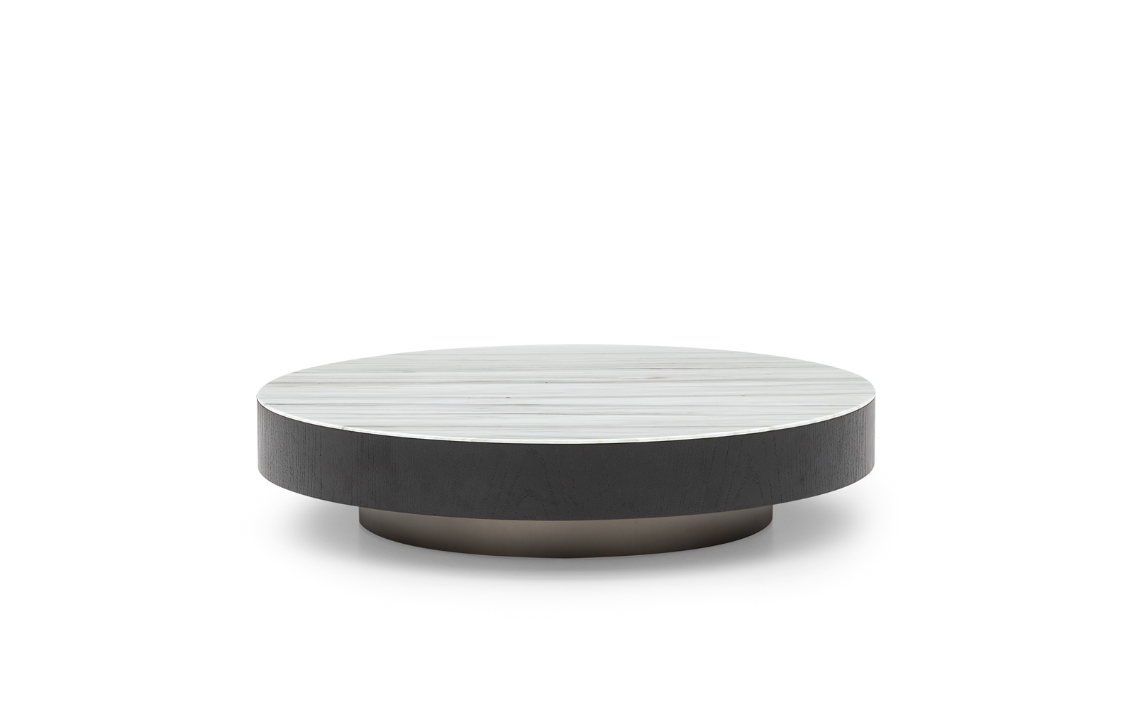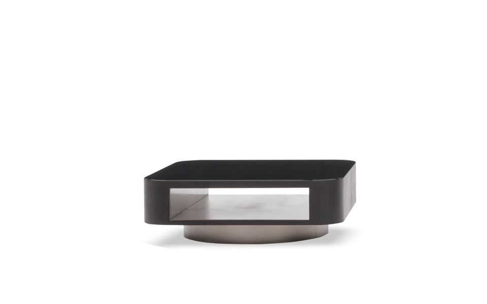 Lo zoccolo arretrato in metallo satinato verniciato colore Bronzo rende flottante la struttura portante, chiusa da una fascia in essenza di rovere spazzolato color Moka, che accoglie il piano in marmo Zebrino o in vetro Nero in pasta.