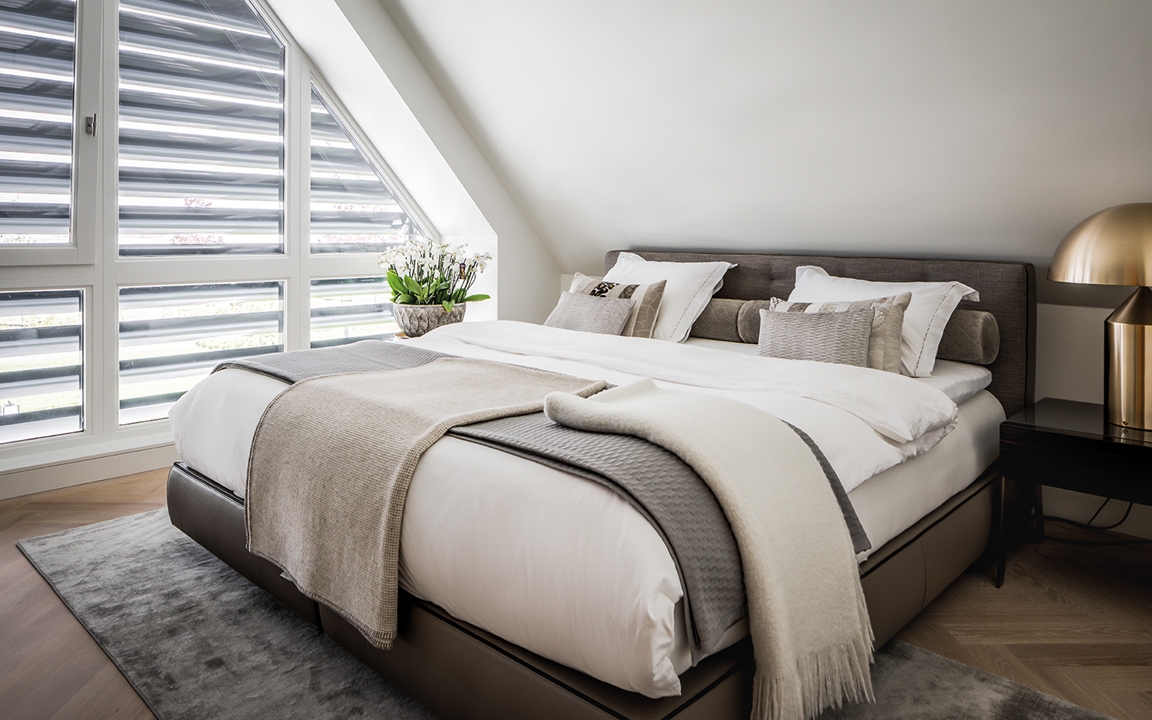 Un linguaggio estetico ben definito che si esprime in un’accurata selezione di materiali, accostamenti tessili e materici raffinati sui toni dei beige, dei marroni e dei grigi. Una palette di colori neutri valorizzata da un raffinato parquet a tinte chiare posato a spina di pesce che conferisce luminosità agli spazi.