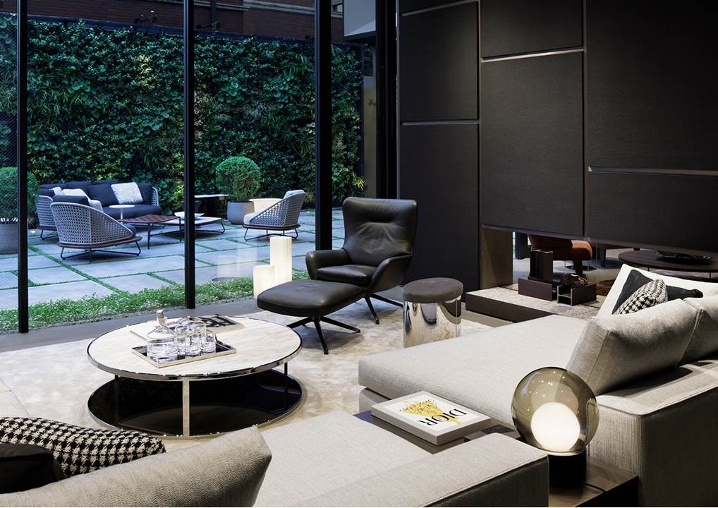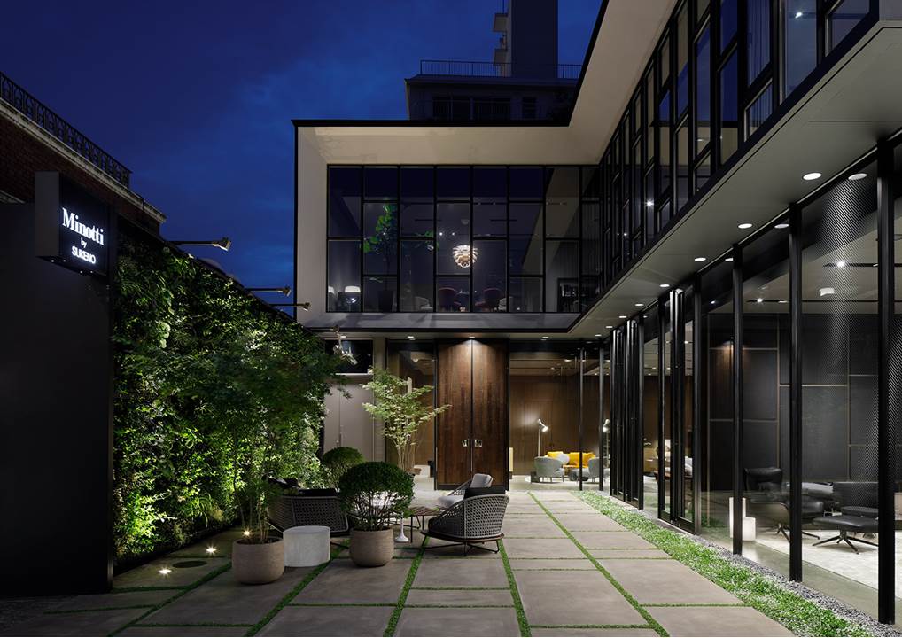 Il progetto di allestimento, - a cura di Minotti Studio - ha declinato i canoni estetici che caratterizzano il brand in in uno spazio dal gusto raffinato, in perfetta sintonia con lo spirito del luogo. Il concept ricrea la suggestione di una villa contemporanea, con un patio delimitato da un suggestivo giardino verticale, nel quale trova posto la collezione outdoor.