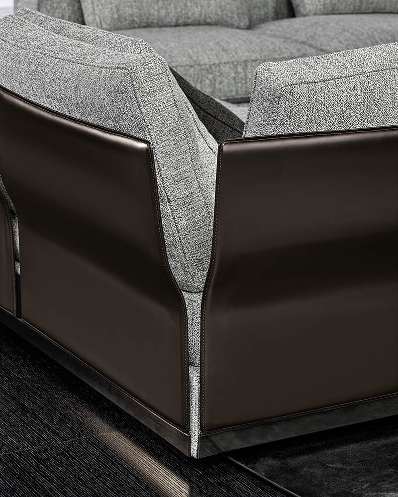 Veri elementi di sorpresa, spezzano lo schema compositivo creando un punto di interesse stilistico, oltre a interrompere l’effetto continuo del rivestimento in tessuto, alleggerendo visivamente sul retro il volume. Una soluzione estetico-formale resa possibile dal know-how progettuale unito al savoir-faire della confezione sartoriale che da sempre identifica la maison Minotti.