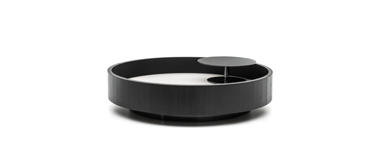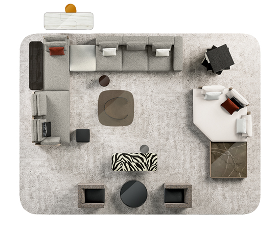 Interessante è la possibile integrazione con i tavolini Amber, con cui entra in un dialogo armonico cromatico e formale, con i tavolini Side, la cui struttura in cuoio rimanda a quella dello schienale, e con le consolle Clive, che creano un gioco di piani anche in sovrapposizione.