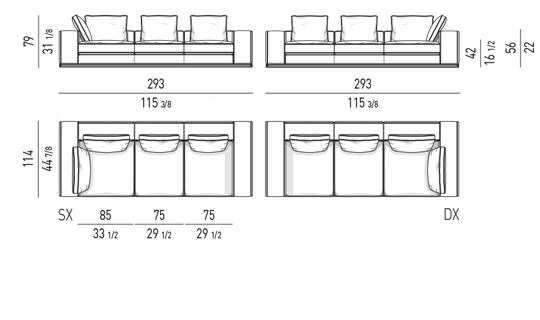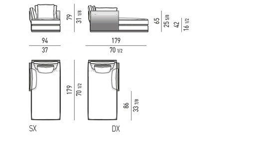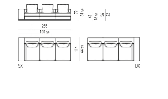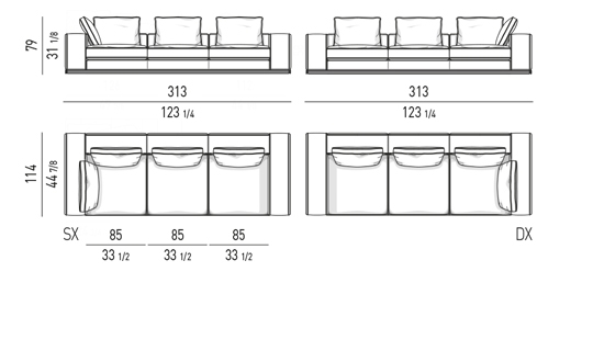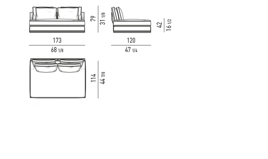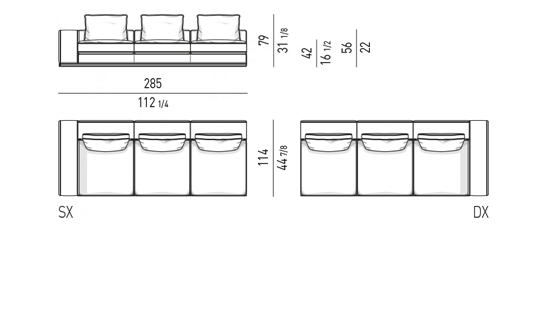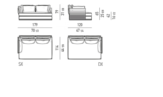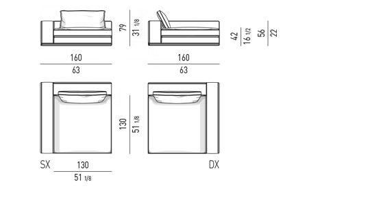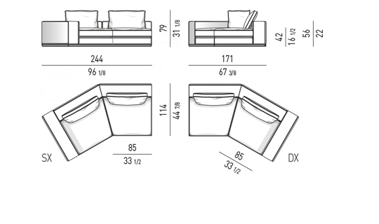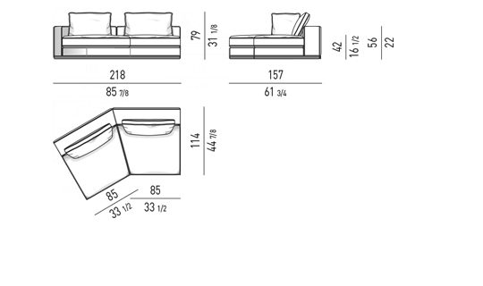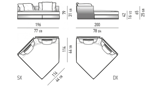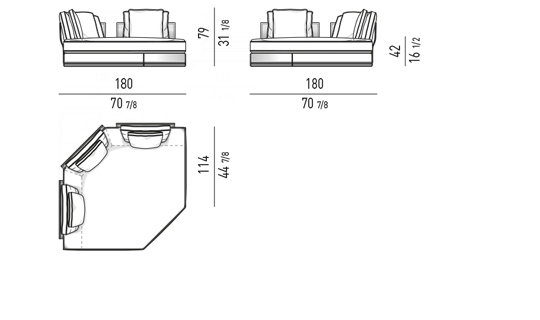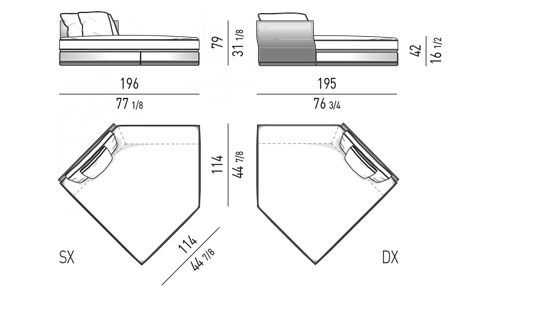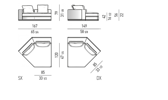Un gioco di sfaccettature anima e interrompe il cubismo che contraddistingue la morfologia del sistema West. Caratterizzato da un’ampia progettabilità, oltre a offrire molteplici possibilità di composizioni più tradizionali, West vede l’intervento di presenze creative, come le chaise-longue a pianta pentagonale o esagonale e gli elementi contraddistinti da schienali in cuoio, sagomati in modo ergonomico, che salgono a sostenere il cuscino schienale.