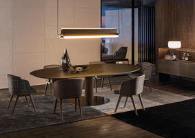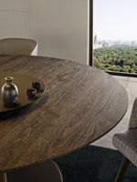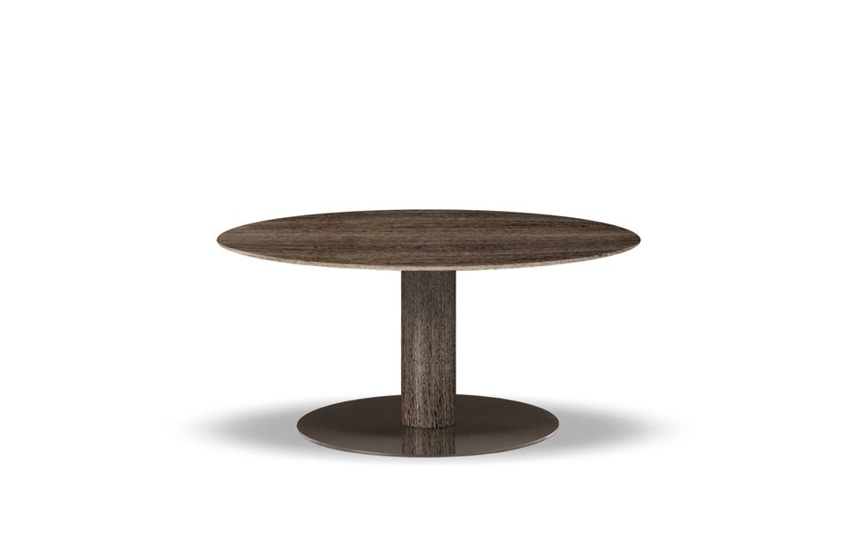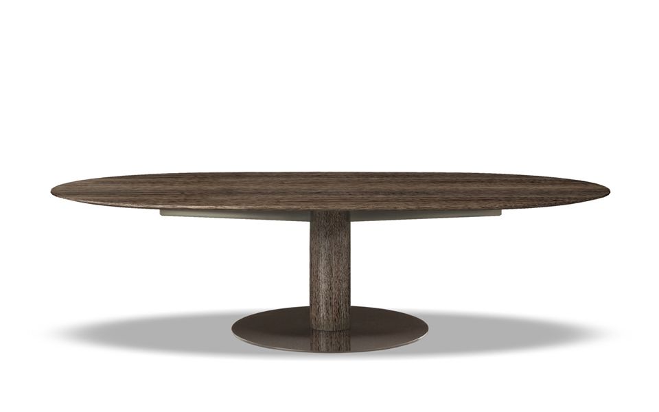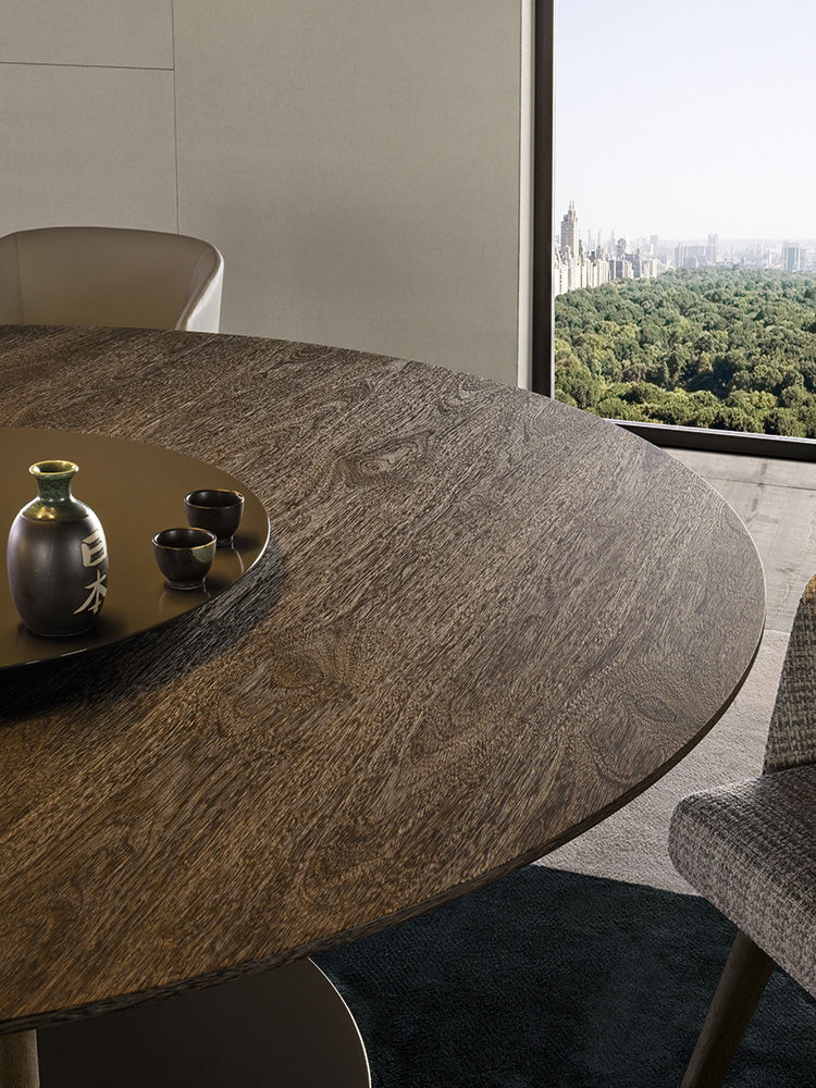Bellagio “Wood”ダイニングテーブルは、ミンク色のステイン仕上げのスクピラ突板を化粧張りしたシングルベースと、ブロンズ色のグロス塗装を施したメタル製フロアサポートが特徴的です。