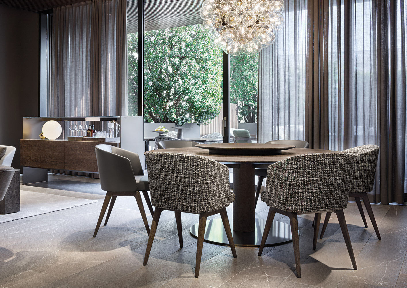 一方、Bellagio “Pewter”ダイニングテーブルのベースは、ピューター色の光沢塗装を施したチューブメタル製です。斜角エッジの天板は、円形、楕円形、正方形、長方形があり、正方形と長方形の天板はコーナーが丸くなっています。サイズと仕上げが異なるため、様々なスタイルの解釈が可能です。ミンク色のステイン仕上げをしたスクピラ材の突板を使用したナチュラルシックなものや、サンド、グラナイト、マッドのグロスラッカー仕上げを施した個性的な仕上げもあります。