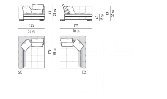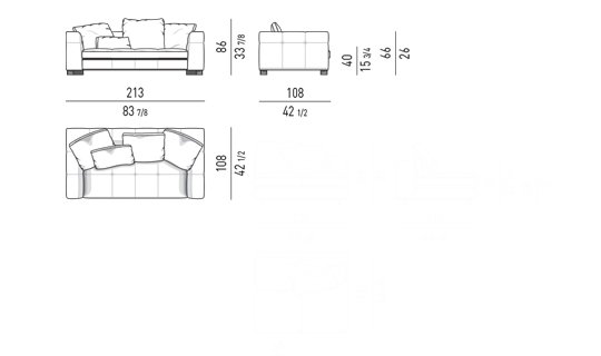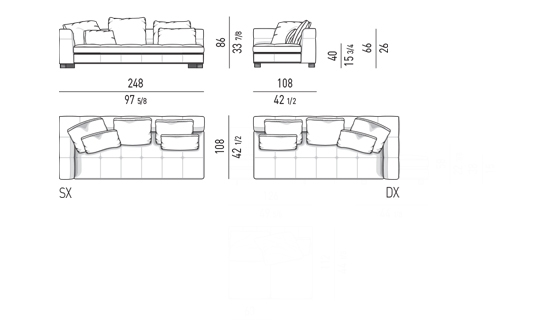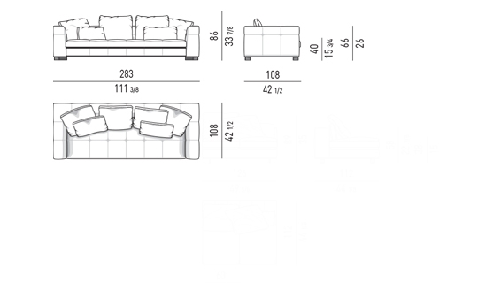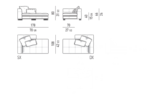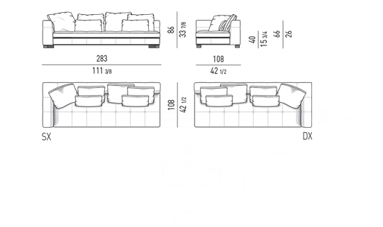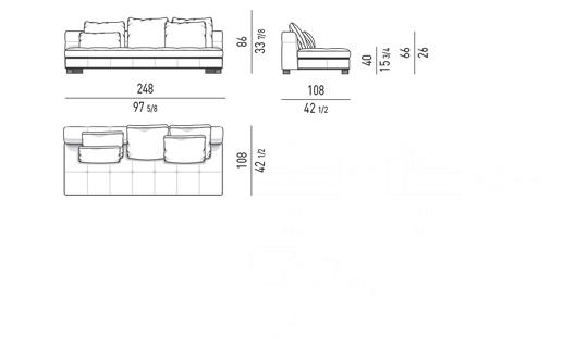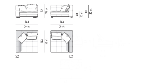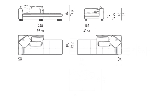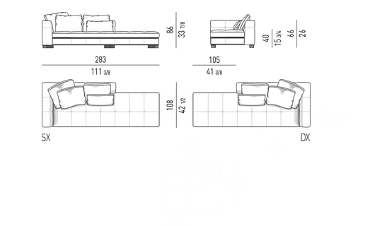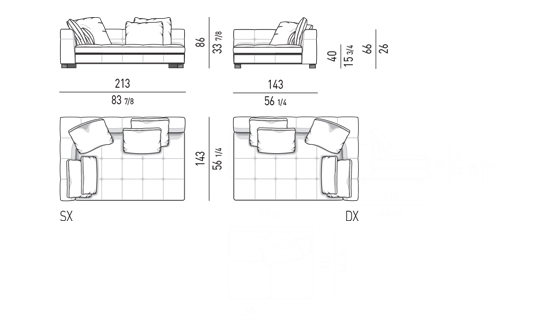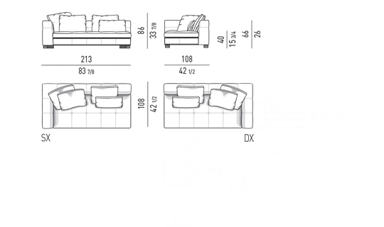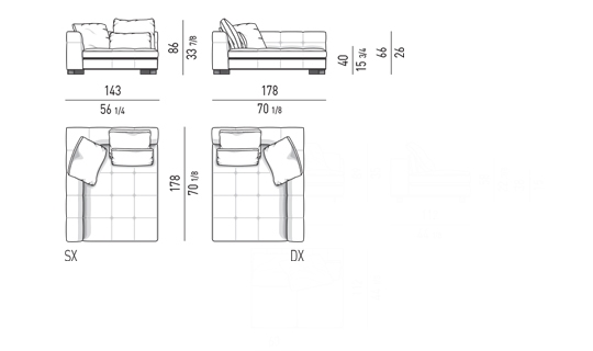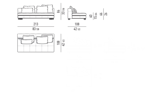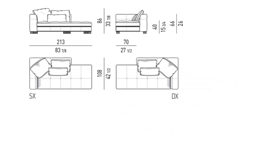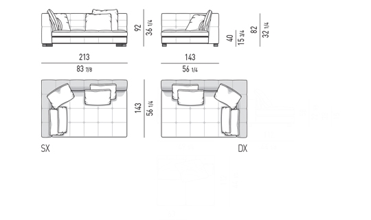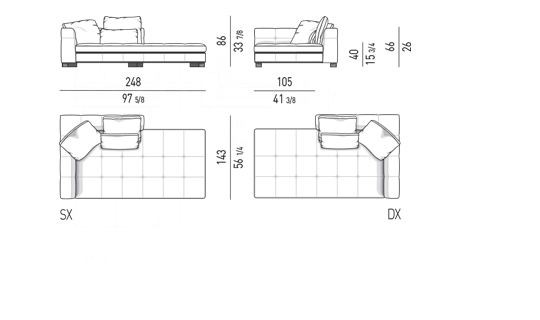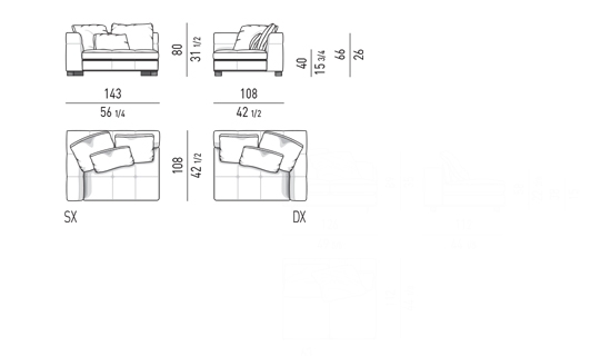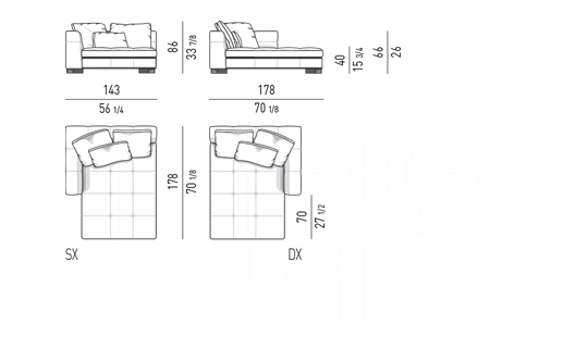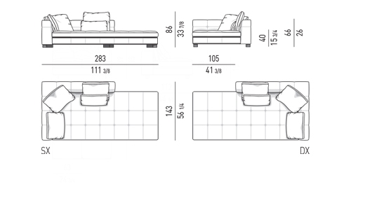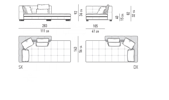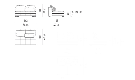 奥行き108cmのソファと奥行き143cmのシェーズロングがあり、バックレストとアームレストには高さの異なるハイタイプ、ロータイプがあります。