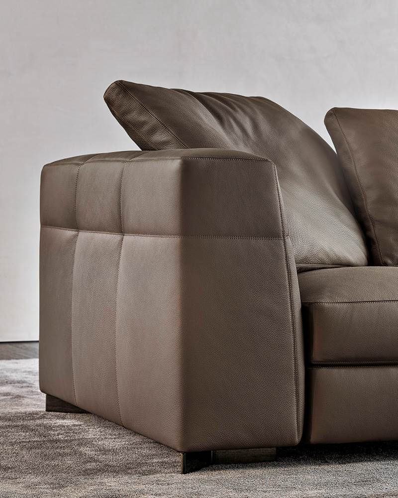 ベース、クッション、アームレスト、バックレストの張地全体に、規則的な帯状のステッチが施され、キルティング効果を生み出すことで座り心地の良いソファになっています。