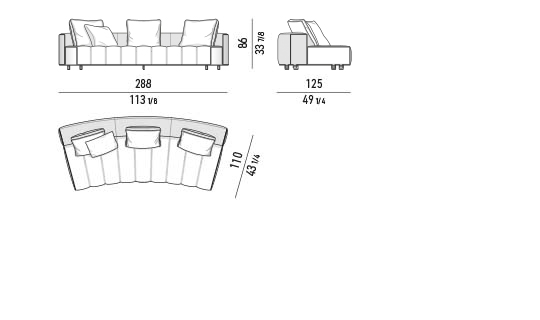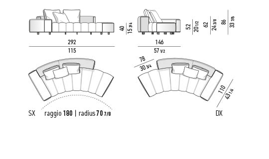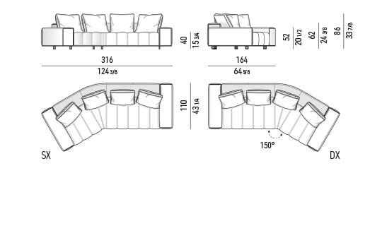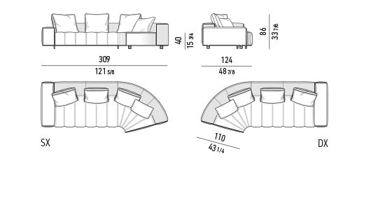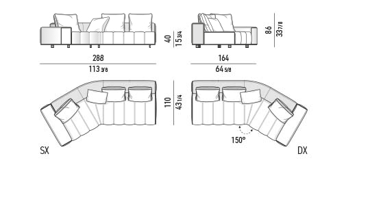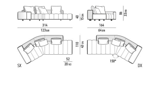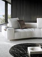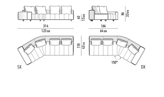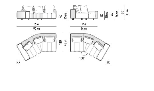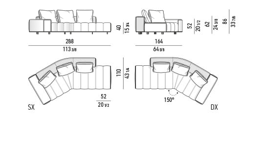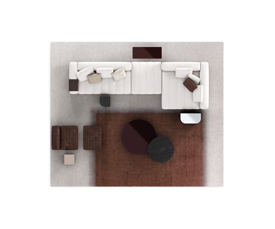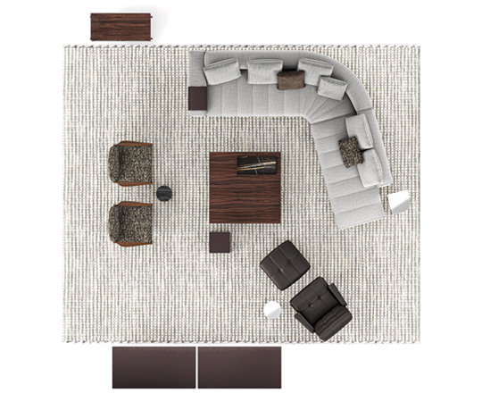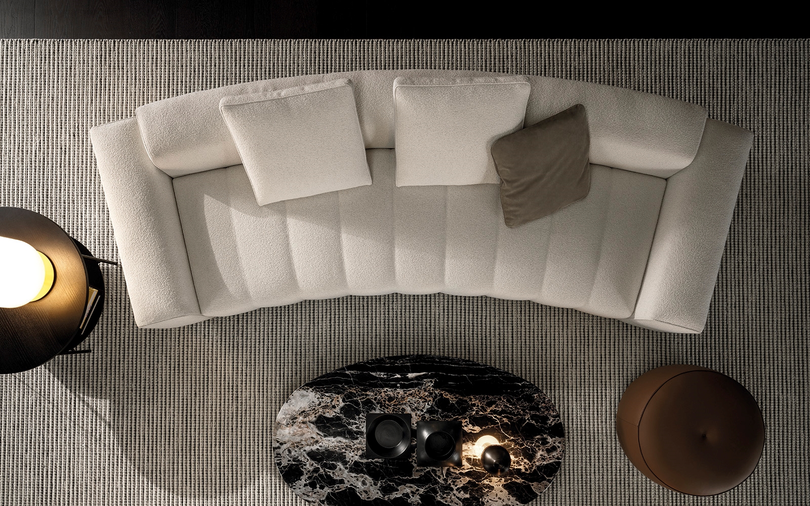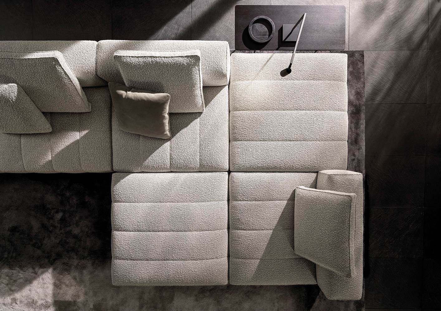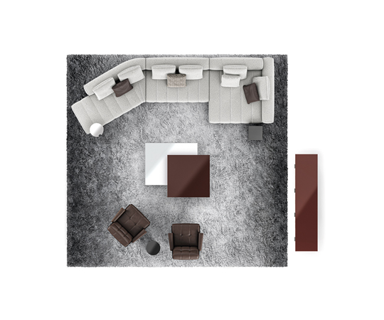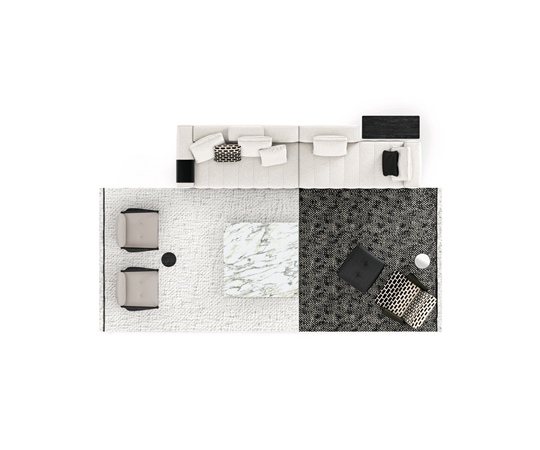 トラディショナルな直線コンフィギュレーションに、よりダイナミックな動きをもたらす曲線や傾斜エレメントが加わりました。際立つ湾曲が特徴的な傾斜エレメントは、30度、75度、90度の角度を持つコンポジションが可能なようにデザインされています。斬新な曲線コンフィギュレーションは、よりトラディショナルなモジュールと組み合わせても、しなやかな湾曲を描く外観をもたらすことができ、リビングルームの新しいアレンジメントを実現します。個々の多様なニーズやテイスト、そして住宅における暮らし方の絶え間ない変化に触発されながら、常に進化し続ける柔軟なシステムです。
