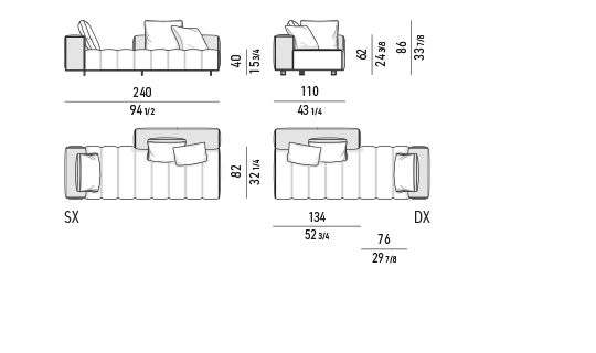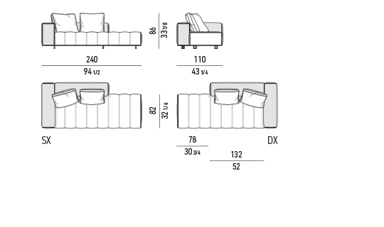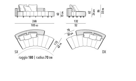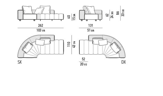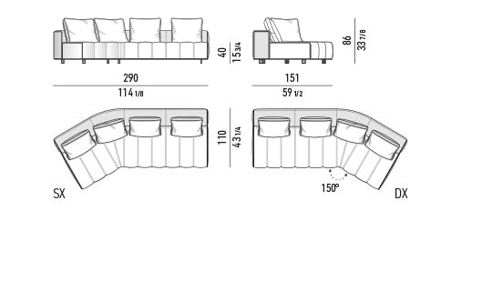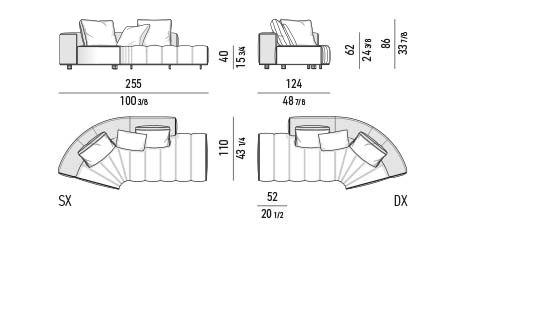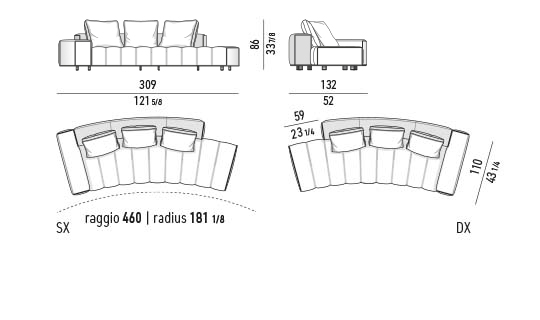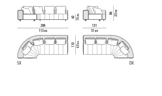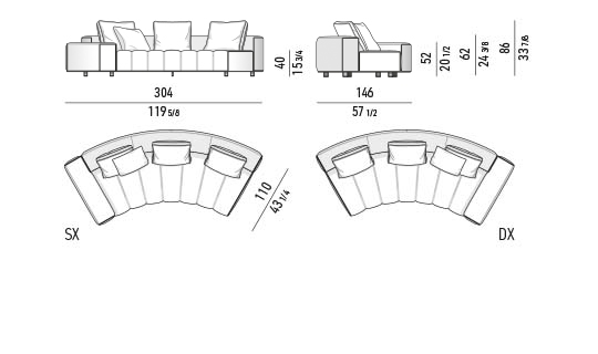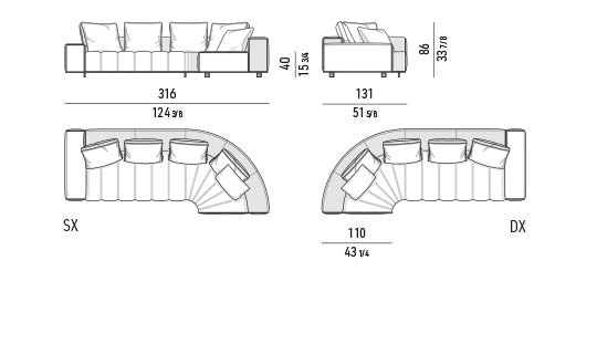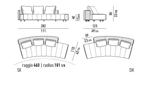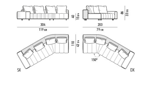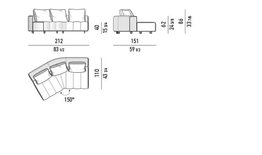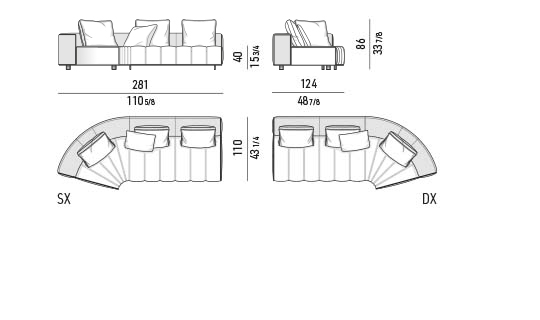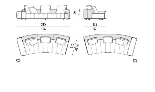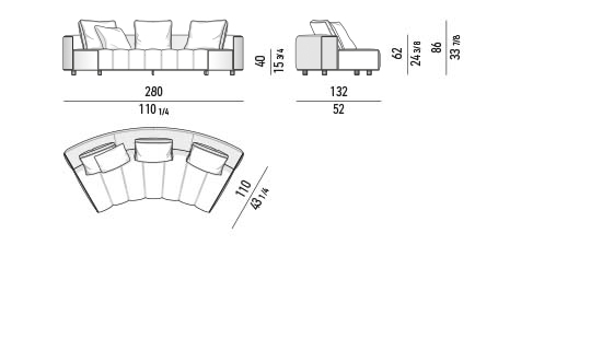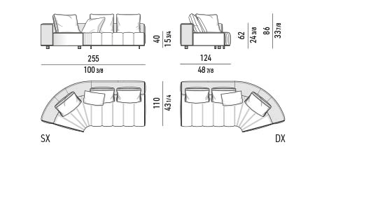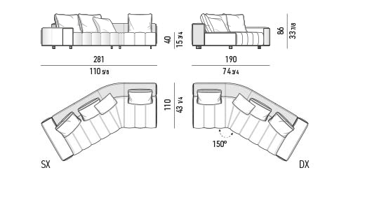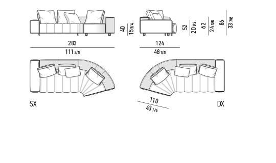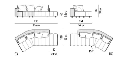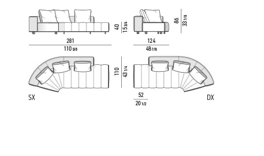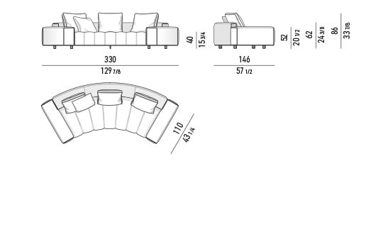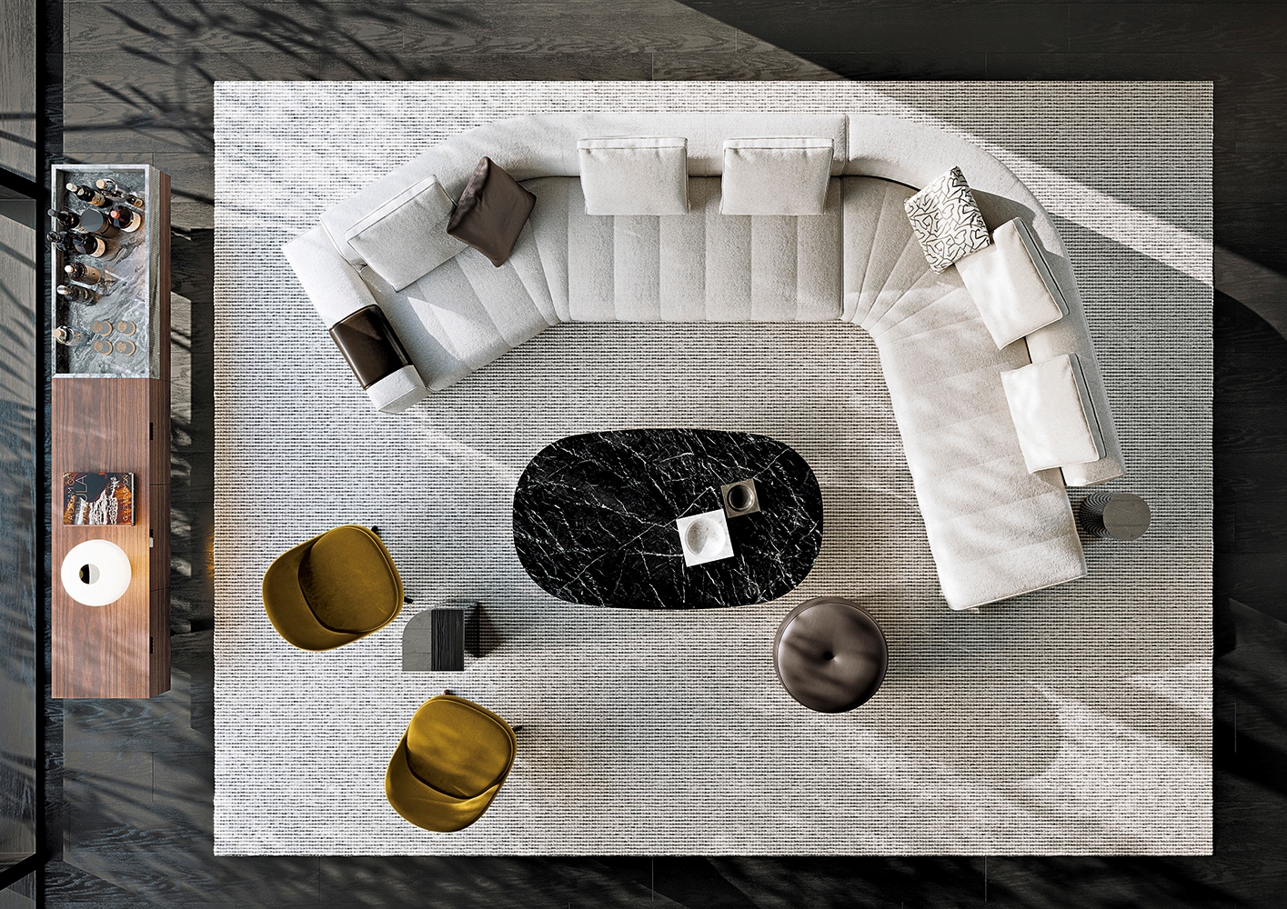 トラディショナルな直線コンフィギュレーションに、よりダイナミックな動きをもたらす曲線や傾斜エレメントが加わりました。際立つ湾曲が特徴的な傾斜エレメントは、30度、75度、90度の角度を持つコンポジションが可能なようにデザインされています。斬新な曲線コンフィギュレーションは、よりトラディショナルなモジュールと組み合わせても、しなやかな湾曲を描く外観をもたらすことができ、リビングルームの新しいアレンジメントを実現します。個々の多様なニーズやテイスト、そして住宅における暮らし方の絶え間ない変化に触発されながら、常に進化し続ける柔軟なシステムです。