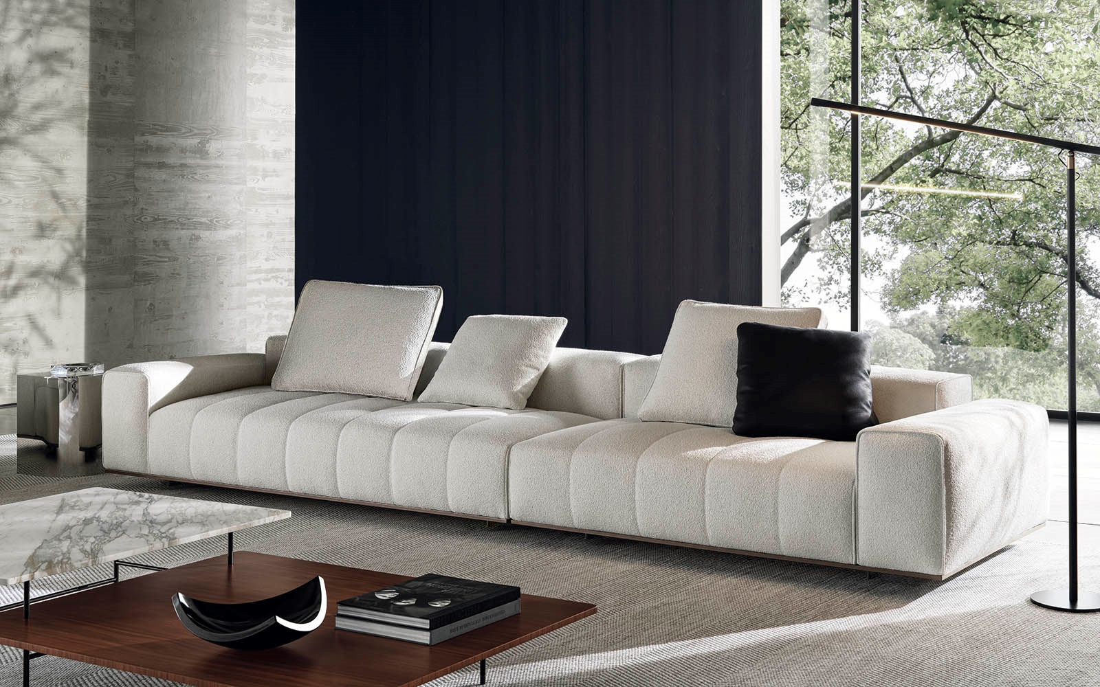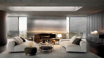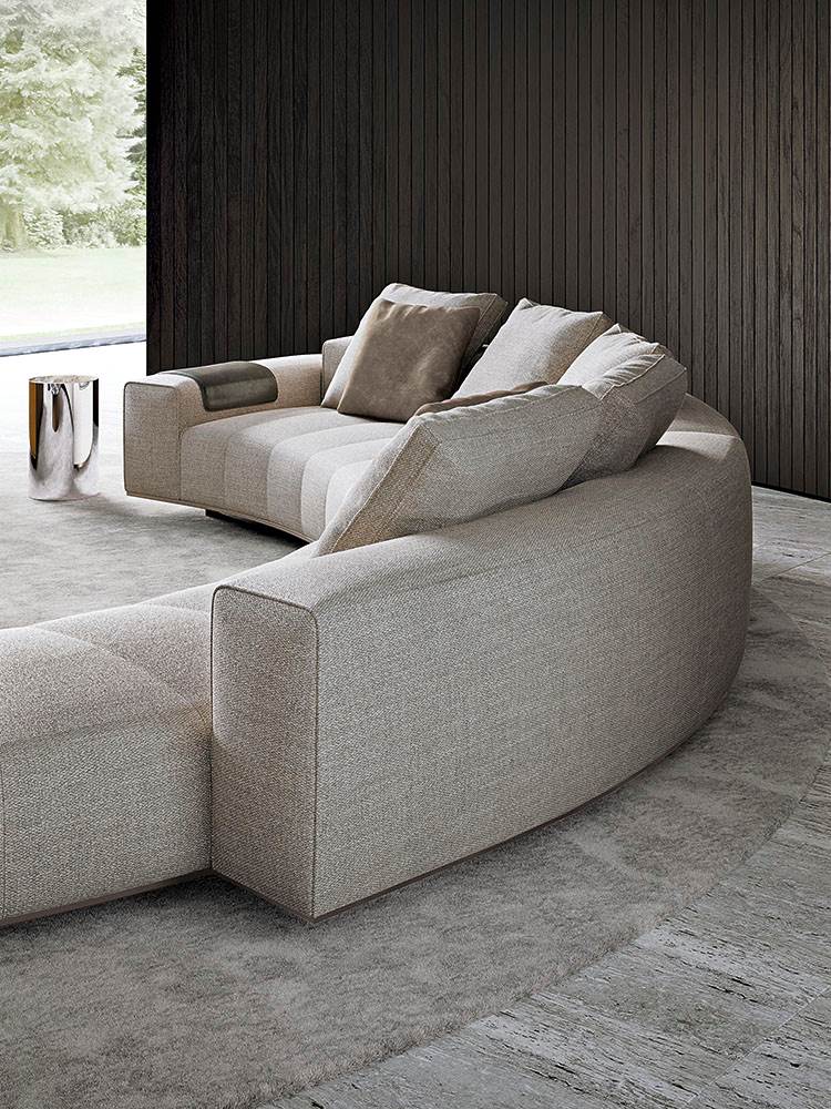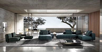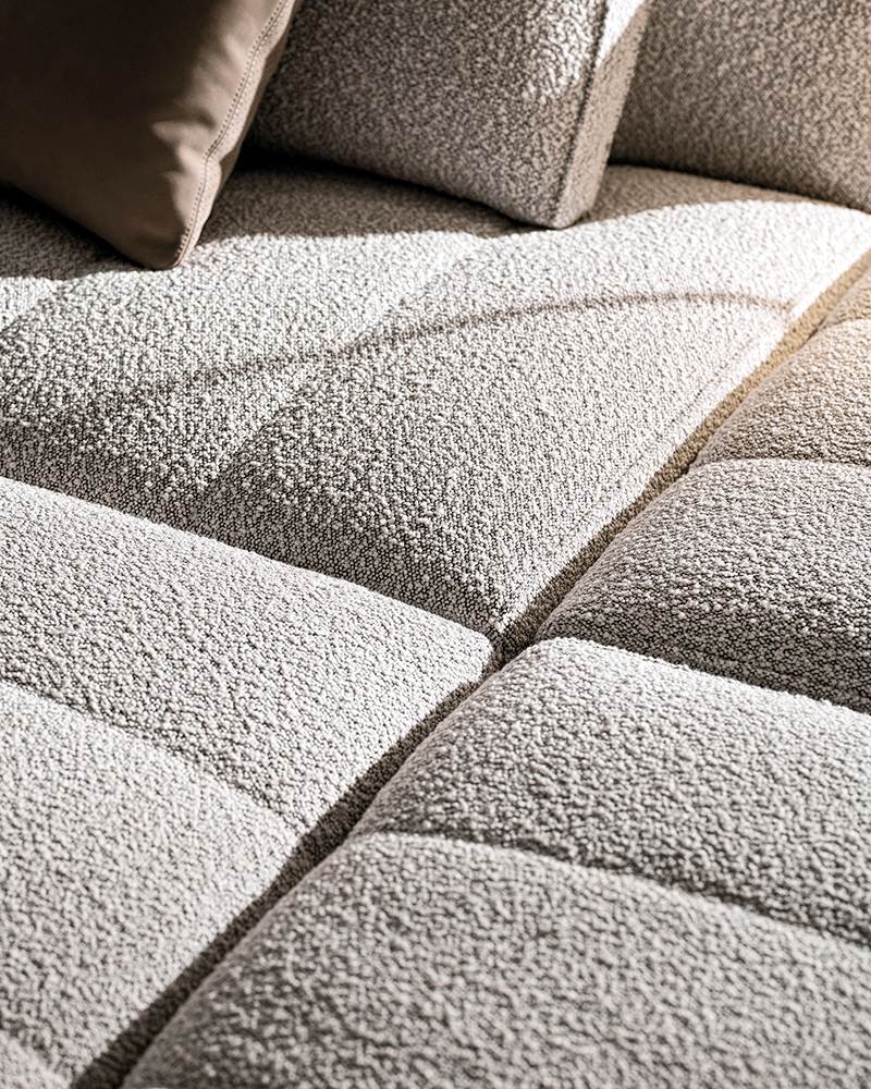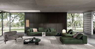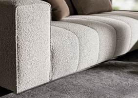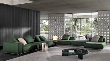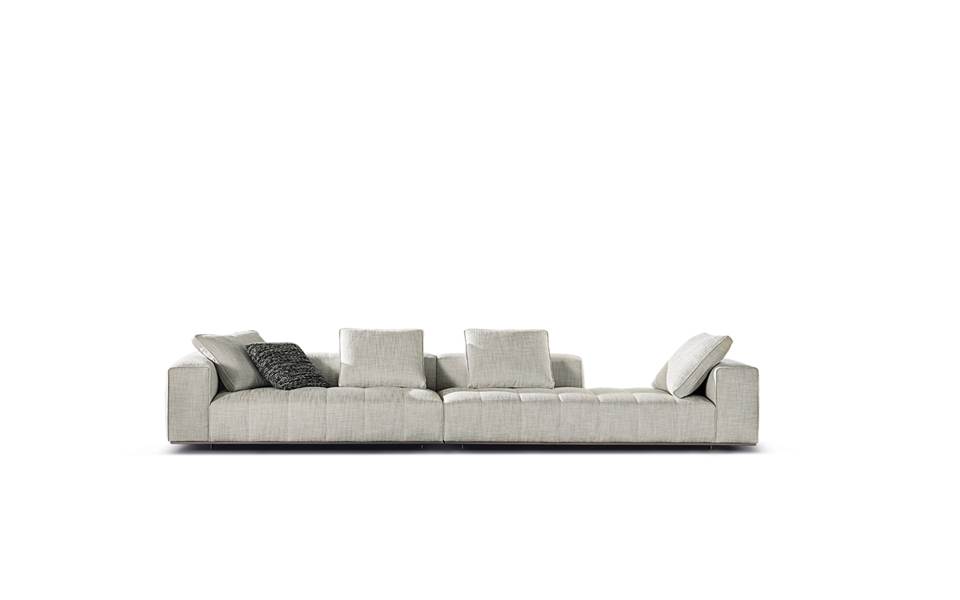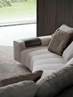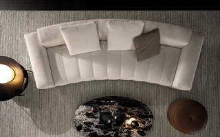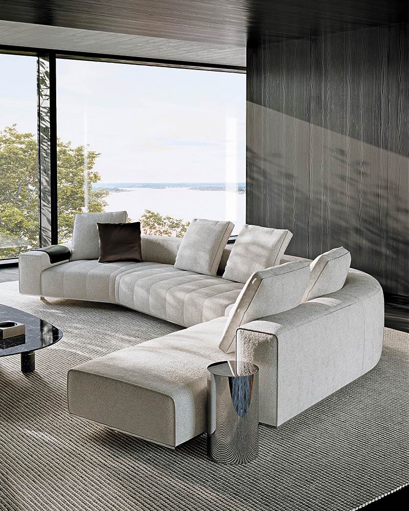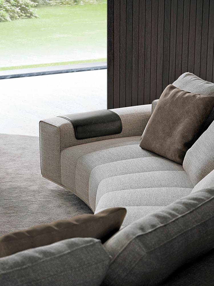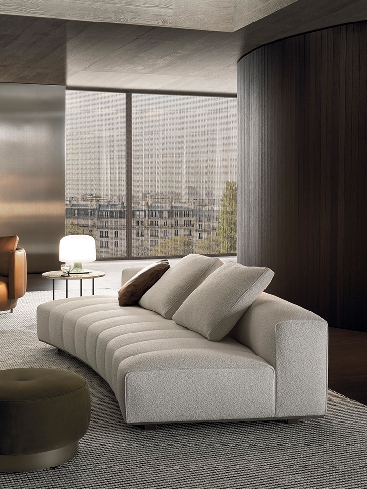 ’70年代からインスピレーションを受けたこのプロジェクトは、当時のグラフィック特徴を受け継ぎ、象徴的なラインを重ねたり交差させることで、さまざまに変化する柔軟性を備えています。Goodmanでは、Minottiが得意とするサルトリア仕上げのマトラッセステッチが、シートに影と光を描き、キルティングパッドのような雰囲気を生み出しています。硬さと柔らかさが同居するこのソファは、フォーマルな使い方も、極上のリラックスタイムにも適しています。