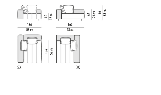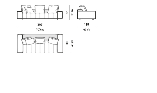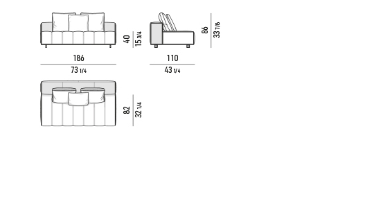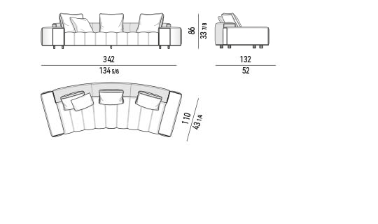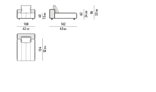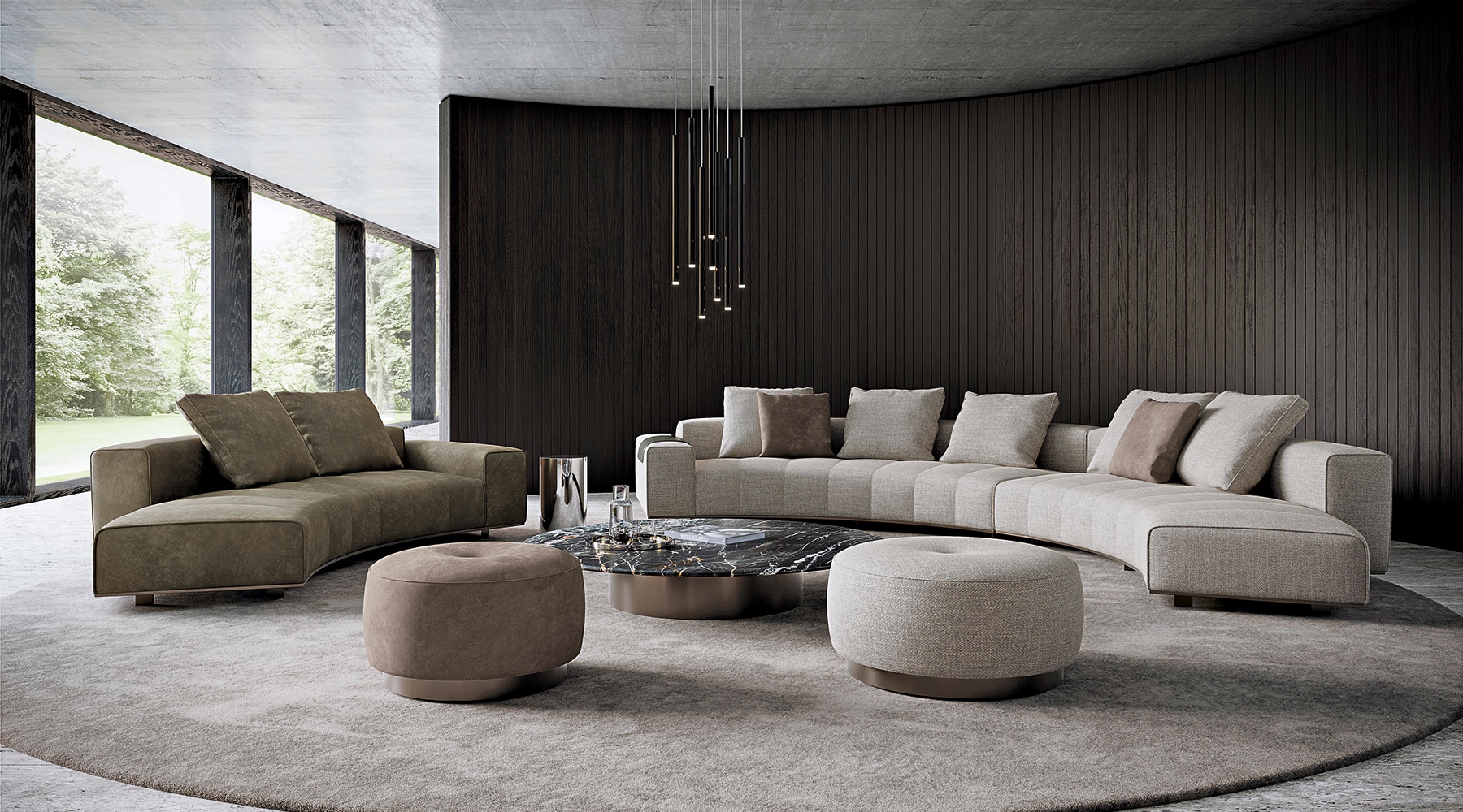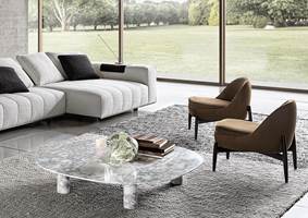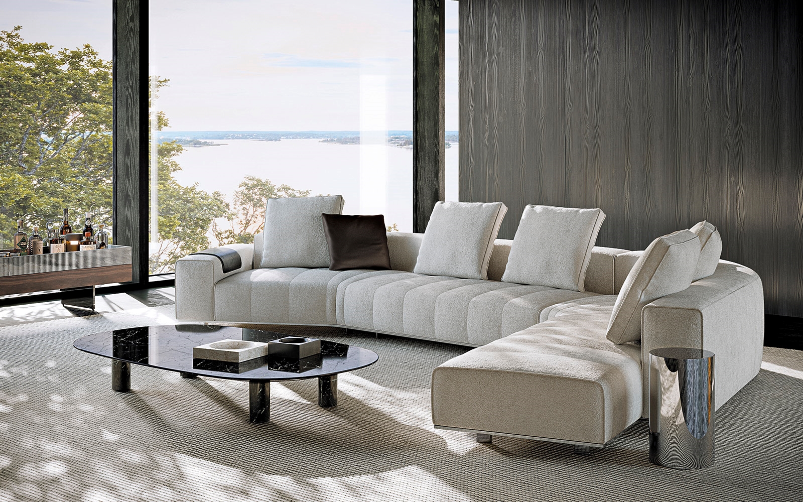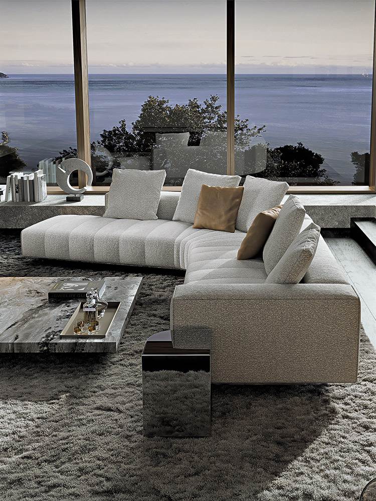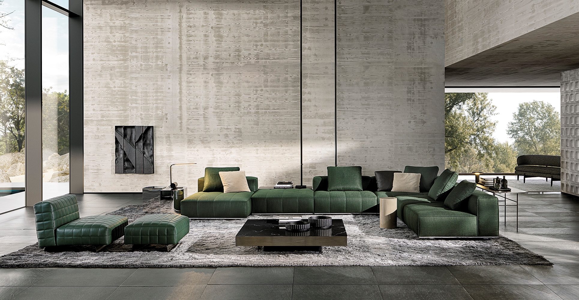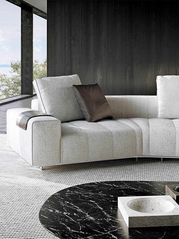 ’70年代からインスピレーションを受けたこのプロジェクトは、当時のグラフィック特徴を受け継ぎ、象徴的なラインを重ねたり交差させることで、さまざまに変化する柔軟性を備えています。Goodmanでは、Minottiが得意とするサルトリア仕上げのマトラッセステッチが、シートに影と光を描き、キルティングパッドのような雰囲気を生み出しています。硬さと柔らかさが同居するこのソファは、フォーマルな使い方も、極上のリラックスタイムにも適しています。