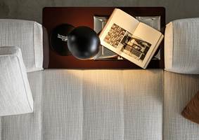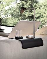 アームレストの幅にぴったりと沿わせてはめられるサドルレザー製トレイは、このシステムに便利さと丸みをプラスし、手元に置ける機能的なコーヒーテーブルにも変身します。