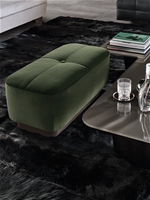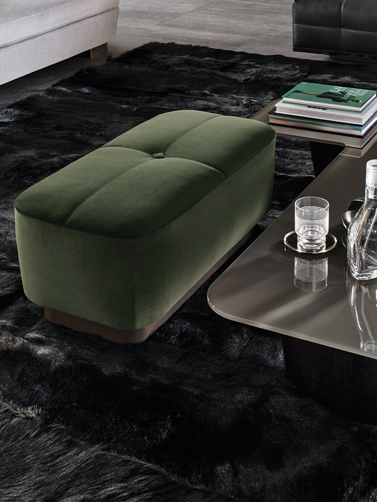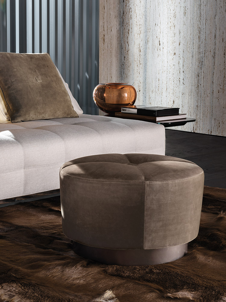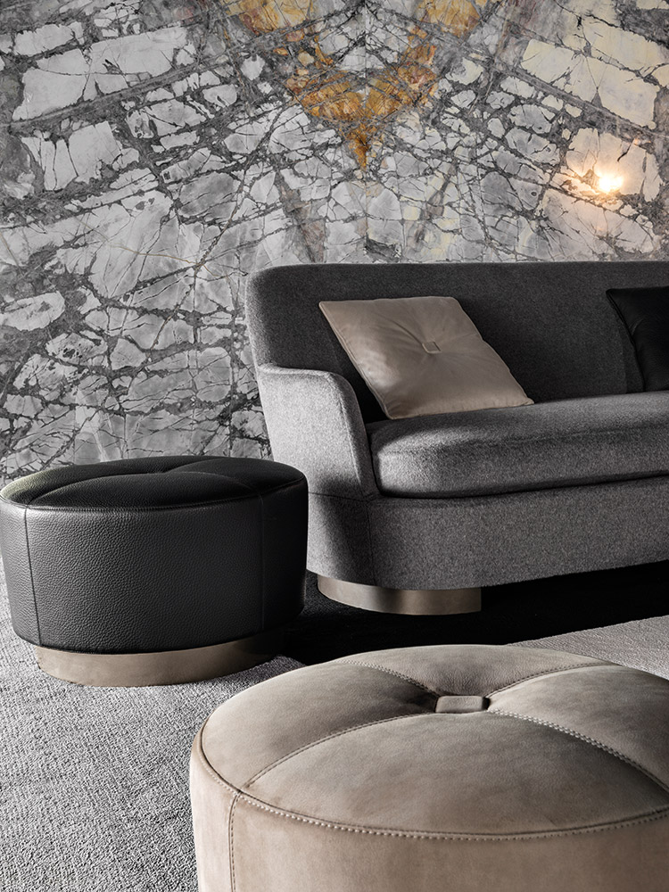 Jacquesシリーズには、さまざまな形やサイズのオットマンもあり、いずれもエレガントなステッチモチーフと四角い飾りボタンが特徴です。