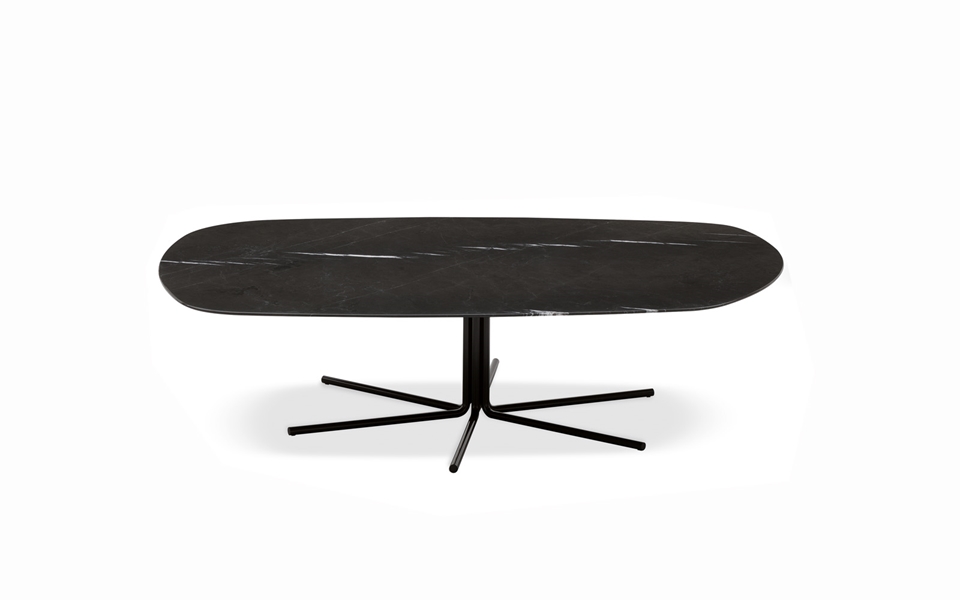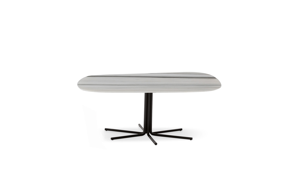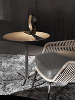 薄くて優美なRaysコーヒーテーブルは、円形または有機的なフォルムの天板形状が特徴です。垂直に立ち上がる金属製ロッドを束にした放射状のベースが、大理石または木製の天板を支えます。