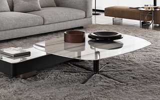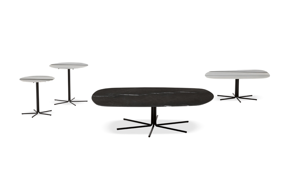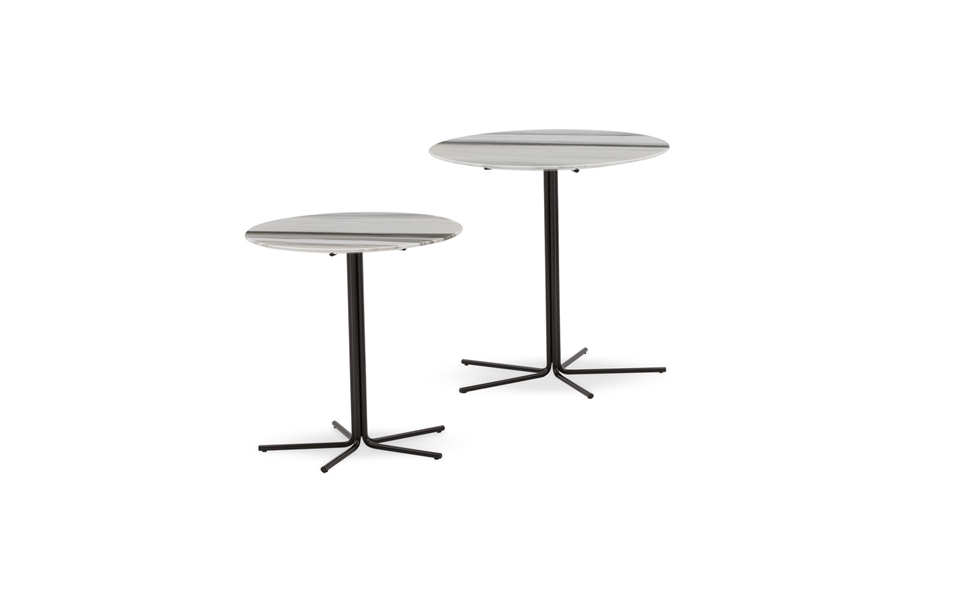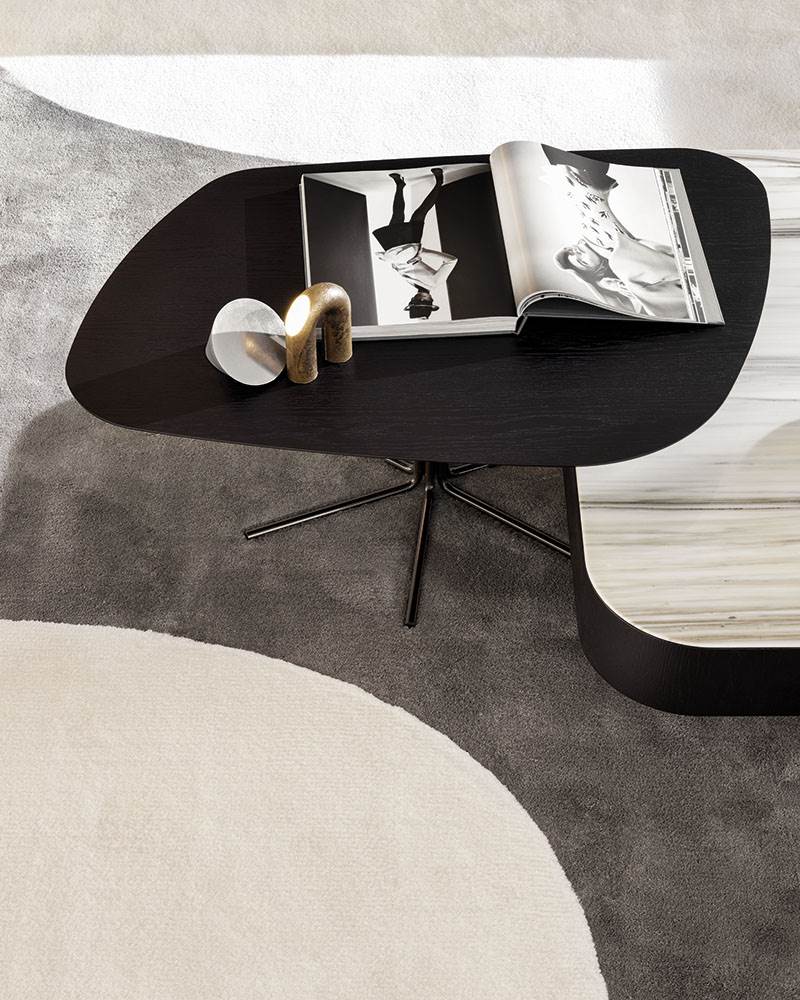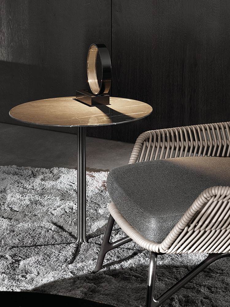 高さや天板の幅が異なるそのスレンダーな構造は、Minottiコレクションの毛足の長いラグの柔らかな厚みに沈み込み、まるで床から立ち上がる細い糸のように見えます。