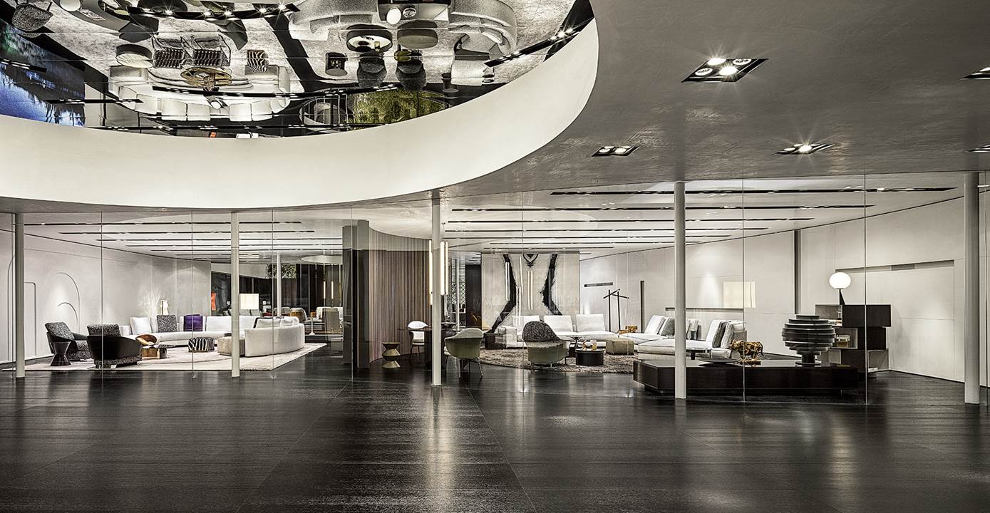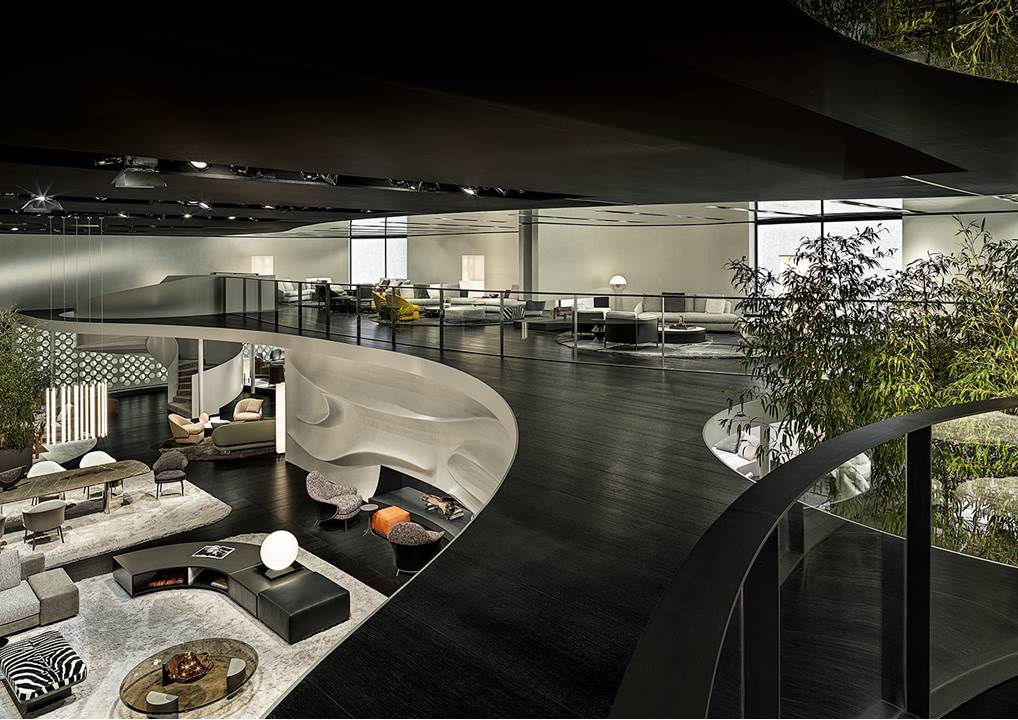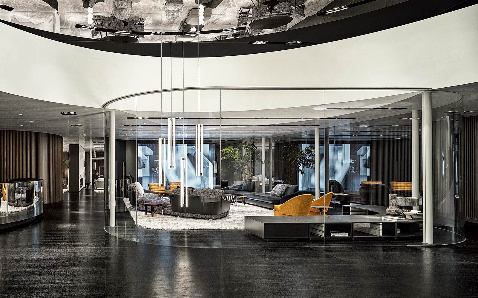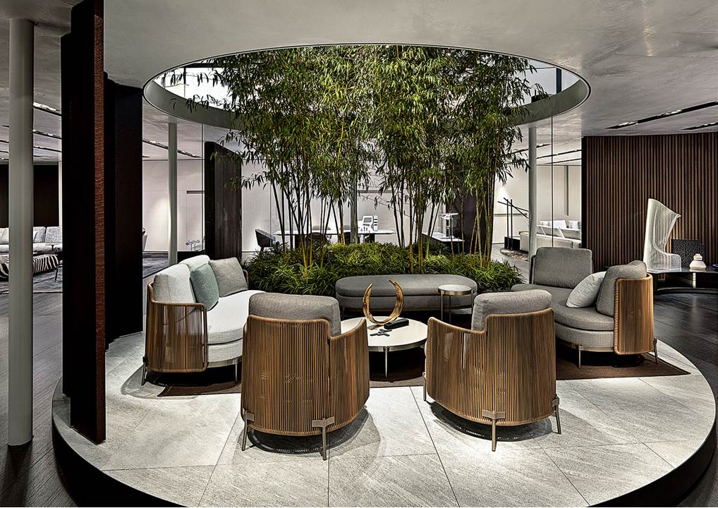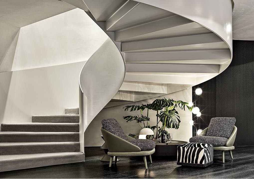On the upper floor, with access through two important helicoidal staircases, a selection of new products has given shape to Minotti’s Hospitality vision, in a succession of conversation and relaxation areas with an intimate and elegant atmosphere.