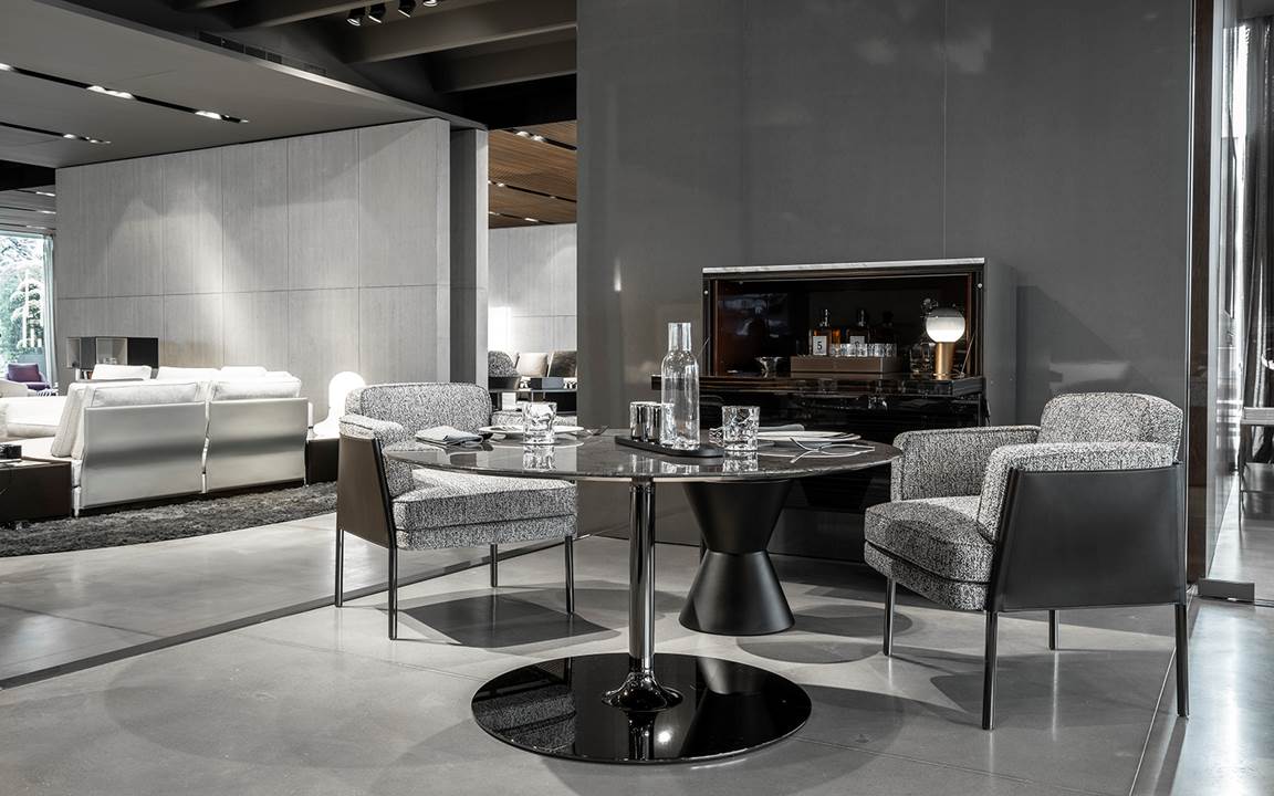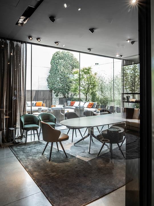 In the sophisticated company showroom, a number of Minotti best-sellers are on display, including the Hamilton seating system, matched with the Suitcase Line armchairs, the Andersen seating system with the Leslie armchairs and the Freeman and Lawrence seating systems. Instead, other corners host some of the most distinctive pieces of the 2018 Collection, such as the Alexander seating system, the Tape Indoor Collection, the Russell sofa and the elegant Dan table designed by Christophe Delcourt.