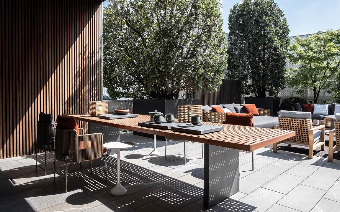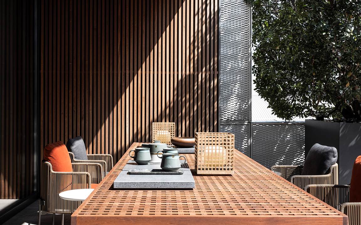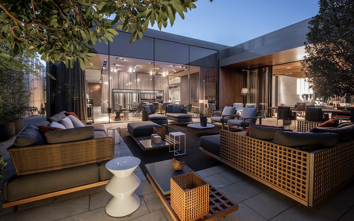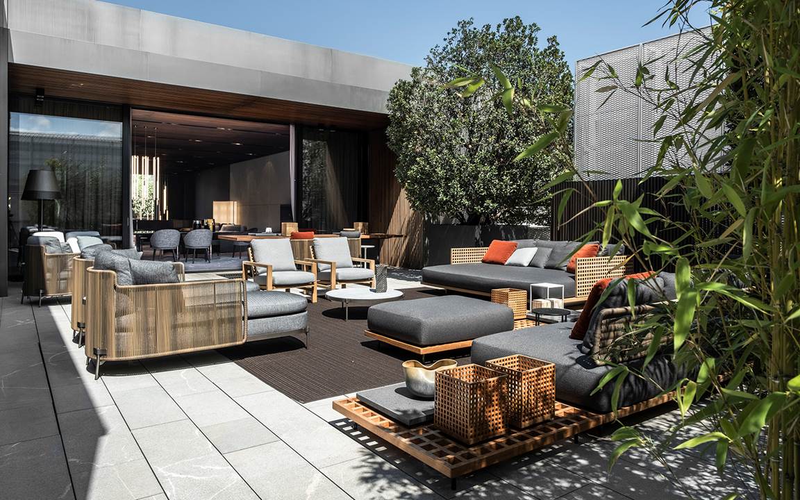 Continuing the aesthetic and stylistic flow between indoor and outdoor areas, the large outdoor area has also been given a new look. The outdoor Quadrado modular system is flanked by the Quadrado armchairs, dining table and double daybed, and a pair of Tape chaise longues by Nendo. A more intimate corner completes the open-air space, animated by several fabric-upholstered Tape Cord Outdoor seats in the shades of pastel grey and light blue.